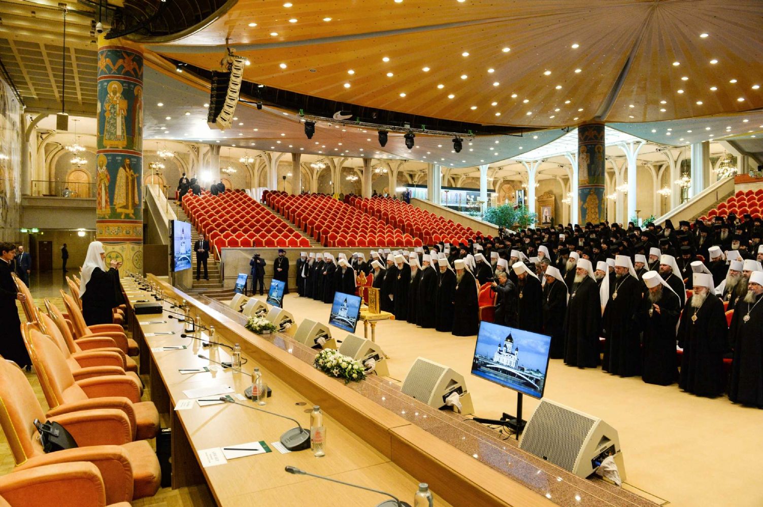 Патриарх Кирилл обратился к иерархам с докладом, в котором, в частности, привел данные о церковной жизни. На сегодняшний день Русская Православная Церковь объединяет 303 епархии (то есть на 10 больше, чем в 2016 году, и на 144 больше, чем в 2009 году). В межсоборный период были созданы три митрополии ― теперь их число достигло шестидесяти. В настоящее время штатное духовенство Русской Православной Церкви состоит из 39 414 клириков, включая 34 774 штатных пресвитера и 4 640 диаконов. В Русской Православной Церкви 36 878 храмов или иных помещений, в которых совершается Божественная литургия. Эта статистика включает в себя данные по дальнему зарубежью и соответствует годовому росту в 1 340 храмов. Кроме того, насчитывается 462 мужских монастыря (то есть на 7 больше, чем годом ранее) и 482 женских монастыря (на 11 больше, чем годом ранее). В дальнем зарубежье действуют более 900 приходов и монастырей Русской Православной Церкви, включая приходы Русской Зарубежной Церкви.