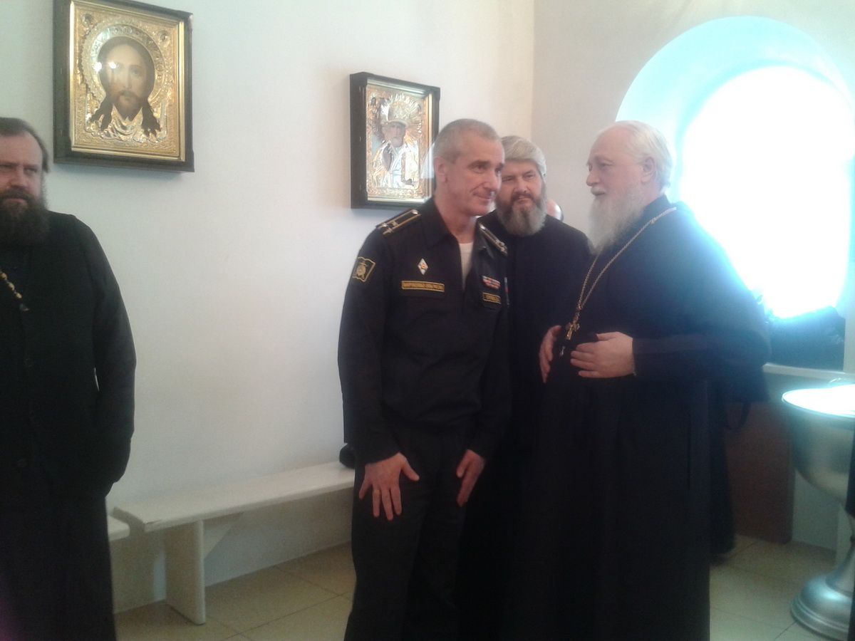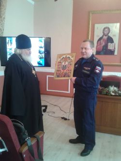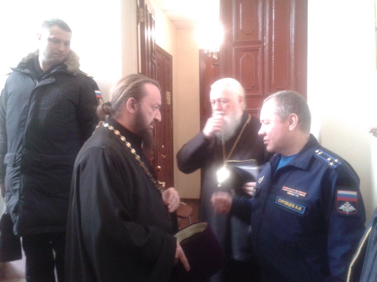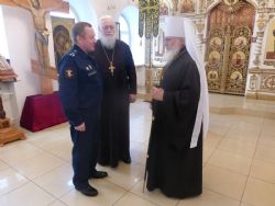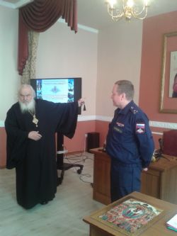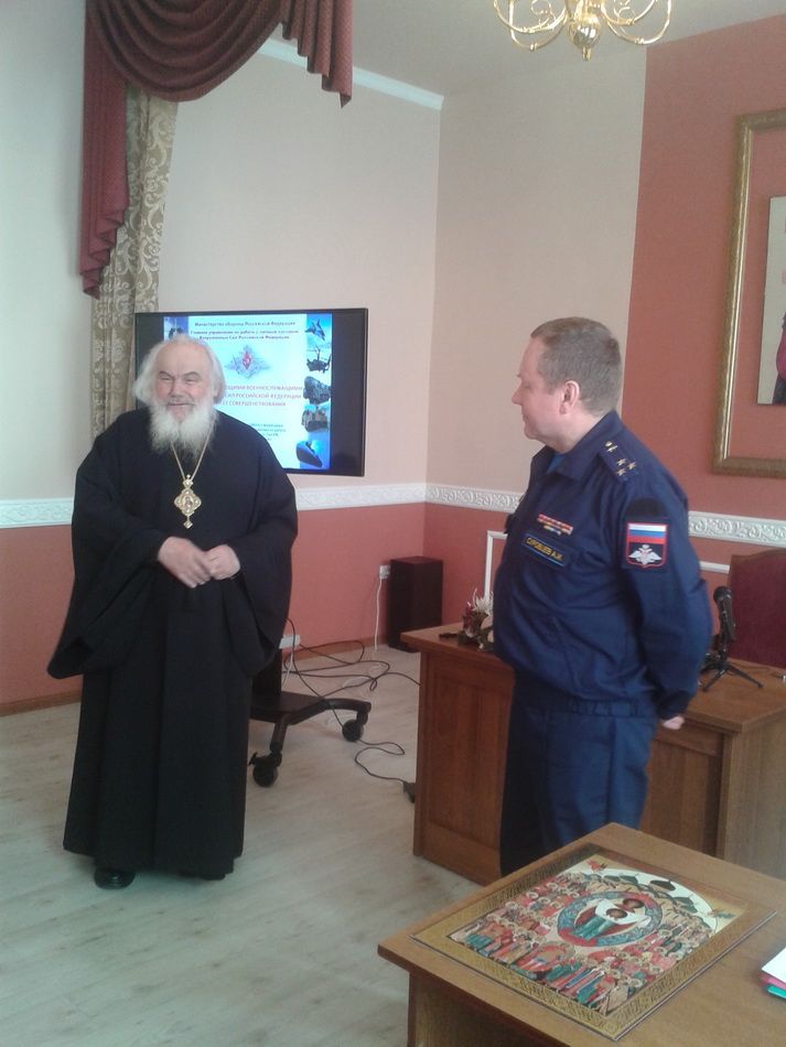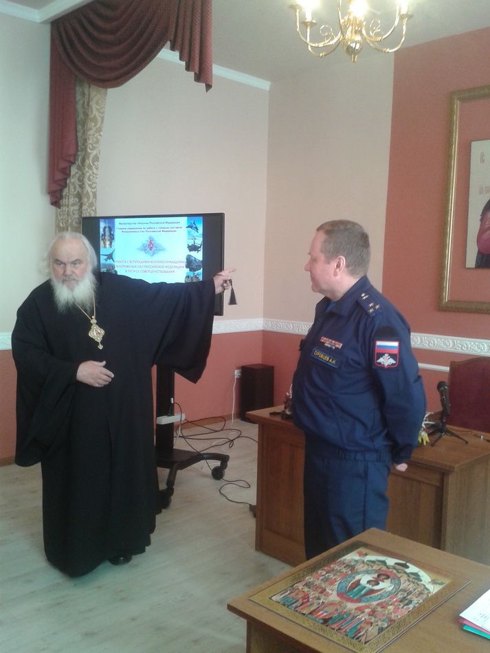 А.И. Суровцев подарил икону Святых покровителей воинства Российского, которая временно будет храниться в крестовом храме преподобного Сергия Радонежского при епархиальном управлении. Александр Иванович вручил памятные вымпелы штатным военным священникам и календари с иконами святых воинов.