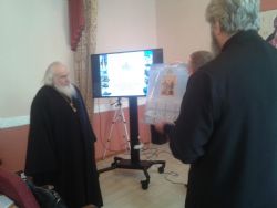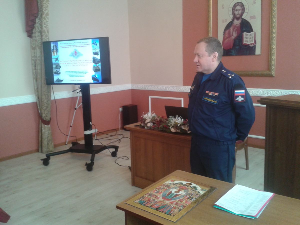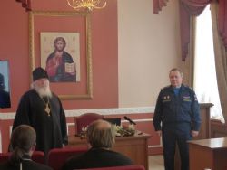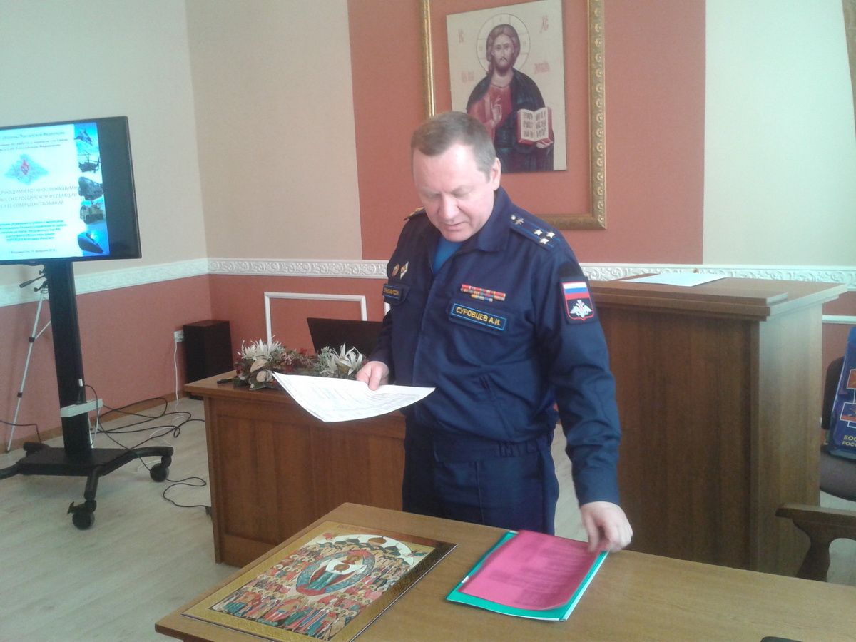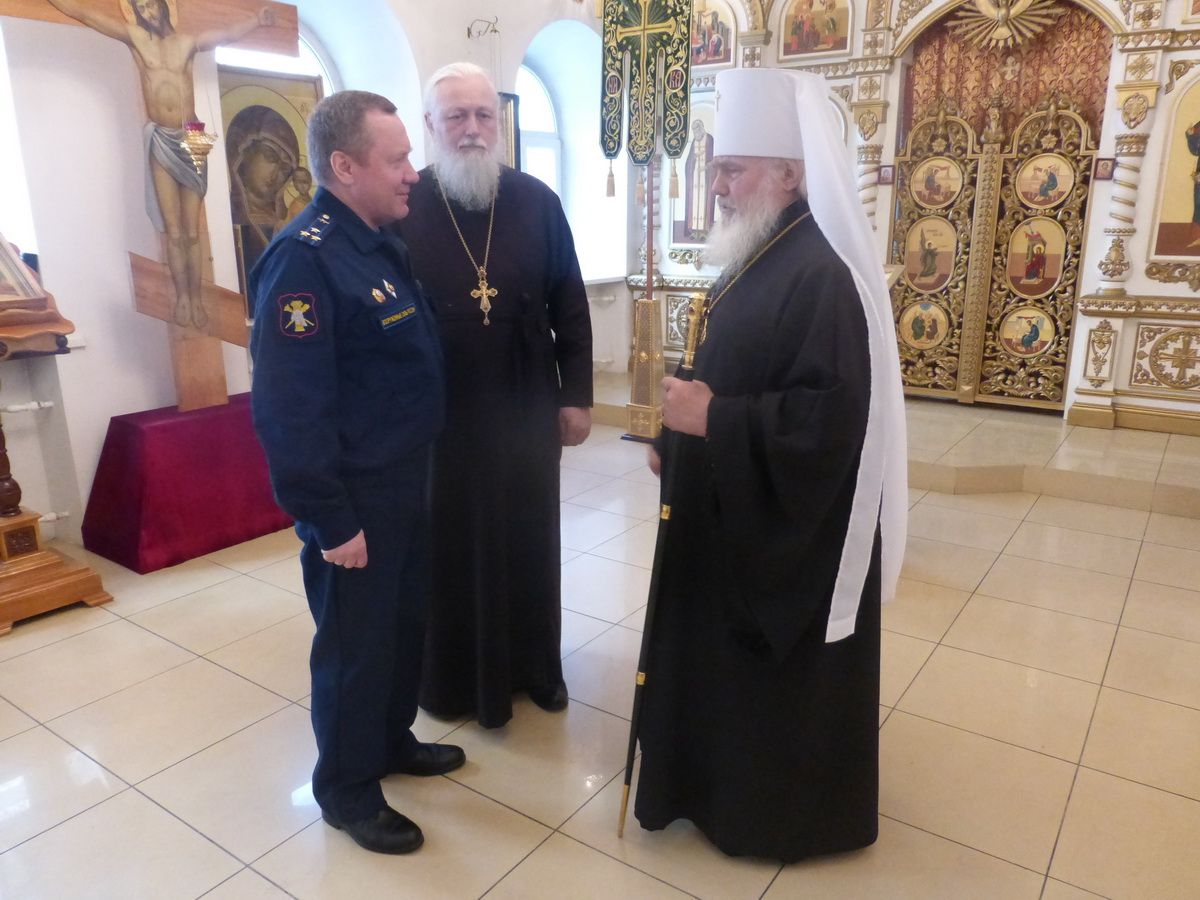 А.И. Суровцев подарил икону Святых покровителей воинства Российского, которая временно будет храниться в крестовом храме преподобного Сергия Радонежского при епархиальном управлении. Александр Иванович вручил памятные вымпелы штатным военным священникам и календари с иконами святых воинов.