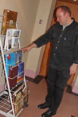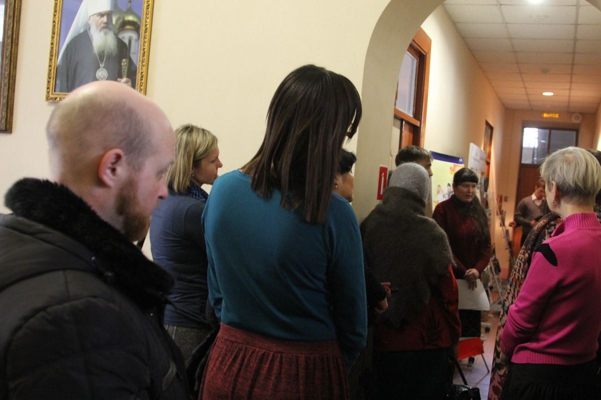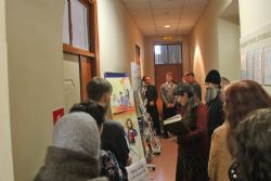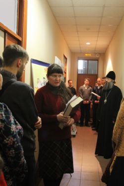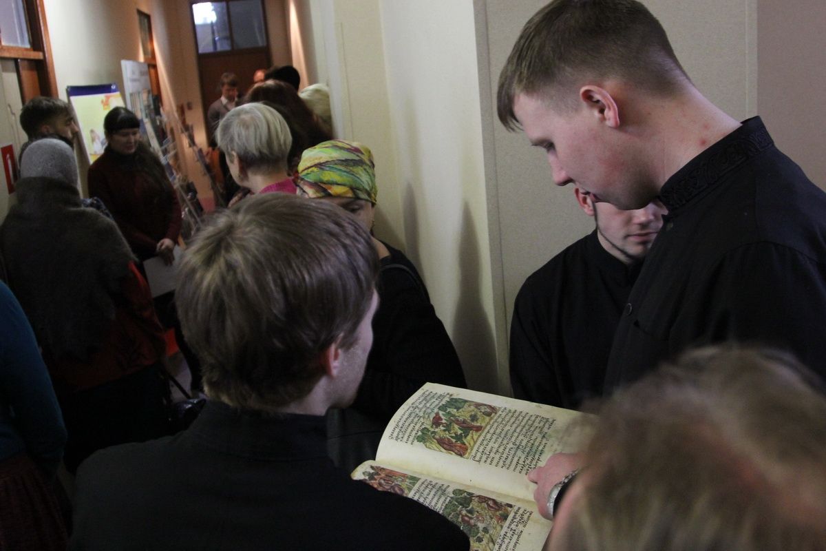 Зав.епархиальной библиотекой Людмила Владимировна Солоненко представила выставку, рассказала о её экспонатах и особо отметила редкие издания, показала репринтное издание рукописной книги XVI века.