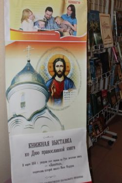 12-13.03.2016. Книжная ярмарка «Свет Христов просвещает всех!». Все желающие могут ознакомиться и приобрести понравившуюся книгу или диск. В первую очередь представлены для обозрения несколько книг Священного Писания, Апостол, Евангелие, на русском и церковно-славянском языках. В просветительских целях подготовлены листовки (буклеты) посвященные памятной исторической дате – выпуску первой на Руси печатной книги диакона Ивана Федорова «Апостол».