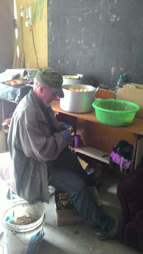 Ситуация немного похожая с Сергеем. Летом помогал фермерам по хозяйству, а зимой спасался от холода в подвале в краевом центре. После травмы (перелом берцовой кости) также оказался без работы. Пока лежал в Тысячекоечной отдел срочной социальной помощи при Администрации Приморского края помог восстановить паспорт. С мая Олег живет на подворье. Находится под наблюдением врача-травматолога, который прописал ему первый месяц постельный режим, сейчас разрешает передвигаться на костылях или коляске. На фотографии Олег в первый раз за полтора месяца пребывания у нас чистит картошку. Олег очень обрадовался возможности что-то делать. Как оказалось, такая несложная работа быстро помогла выйти из депрессии, и процесс восстановления здоровья пошел быстрее.