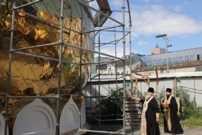 Сначала владыка Вениамин освятил большой крест на главный купол, затем освятил кресты для четырёх малых куполов и освятил сами купола.