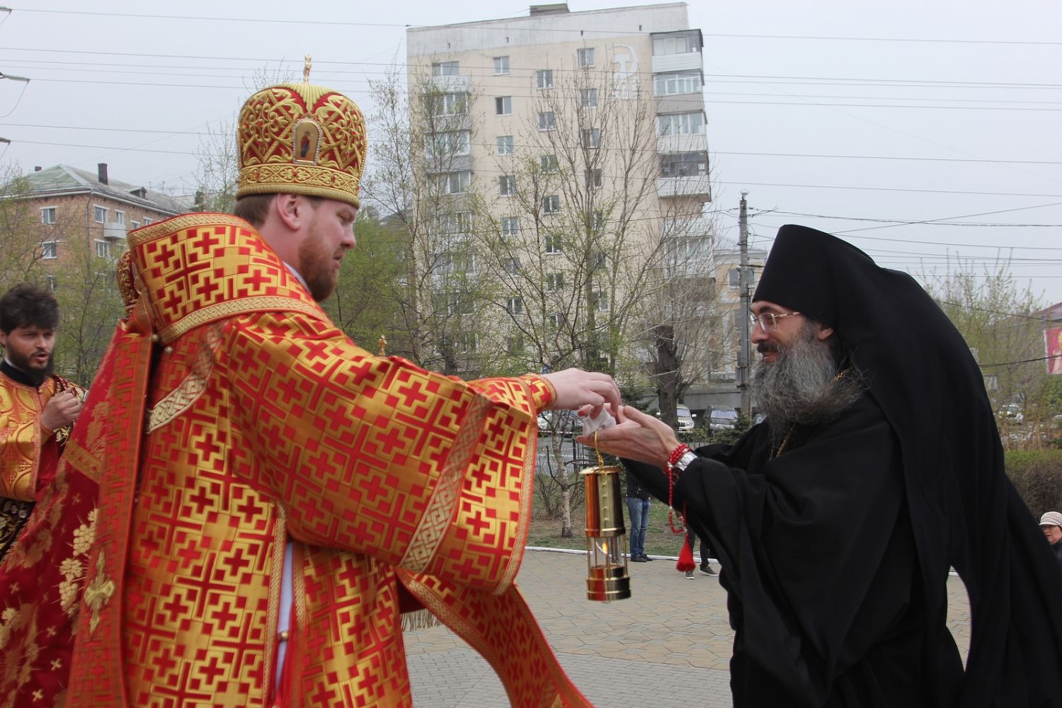 Перед началом богослужения глава Приморской митрополии возглавил торжественную встречу Благодатного огня. Святыню доставил в кафедральный собор викарий Владивостокской епархии епископ Уссурийский Иннокентий.