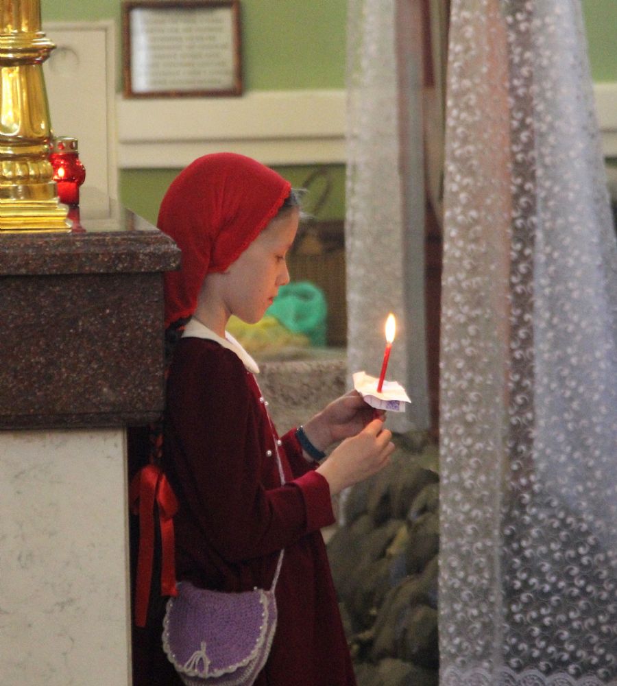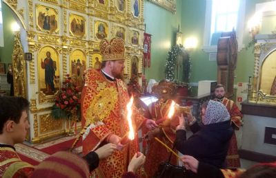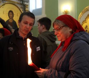 Митрополит Владимир принял лампаду с Благодатным огнем и возжег от принесенного из Иерусалима Огня лампады в алтаре собора. Затем владыка Владимир вышел на солею с возженными иерусалимскими свечами (пучки из 33 свечей составляются по числу земных лет Спасителя) — и раздал Благодатный огонь священникам и прихожанам.