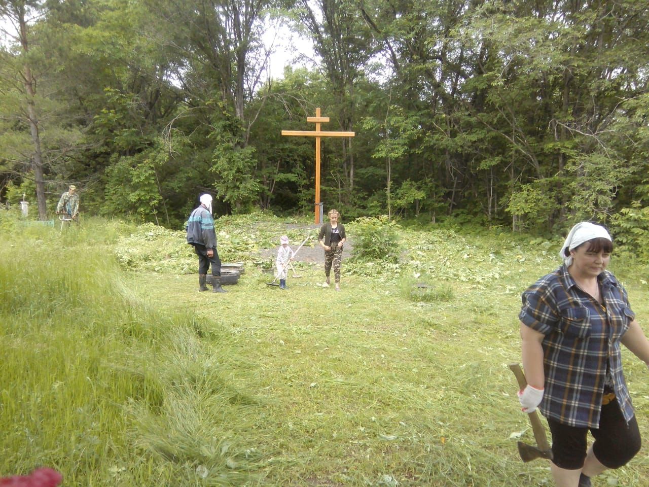 В этом году уборку территории организовала Татьяна Воробьева, которой помогали Максим и Дмитрий Медведевы и Татьяна Савельева. В благоустройстве территории наравне со взрослыми приняли участие и маленькие прихожане Елена, Никита и Валерия.