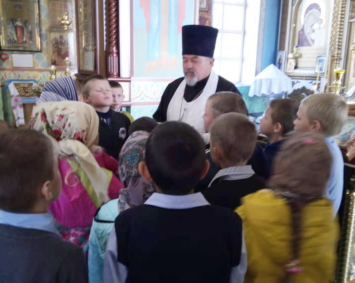 Село Спасское. 19 сентября настоятель храма Вознесения Господня митрофорный протоиерей Владимир Капитанюк встретился с учениками вторых и третьих классов филиала средней школы №4 села Прохоры, которые приехали в храм на экскурсию.
