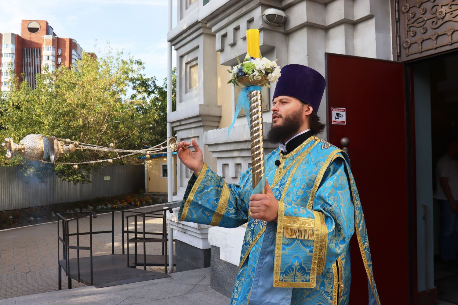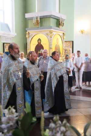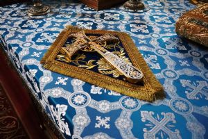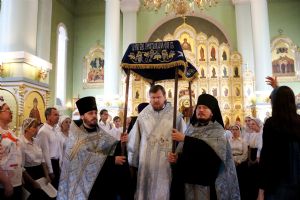 После великого славословия митрополит Владимир возглавил крестный ход с плащаницей с изображением Успения Пресвятой Богородицы и совершил помазание духовенства освященным елеем.