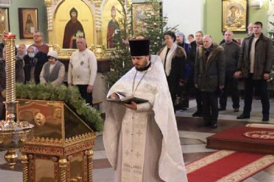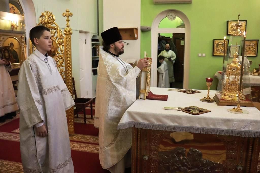 Его Высокопреосвященству сослужили: ключарь собора иерей Владимир Плотников, игумен Антоний (Каменчук), иерей Максим Точуков, ответственный за организацию архиерейских богослужений иерей Дионисий Ищенко, иерей Виктор Архипов.