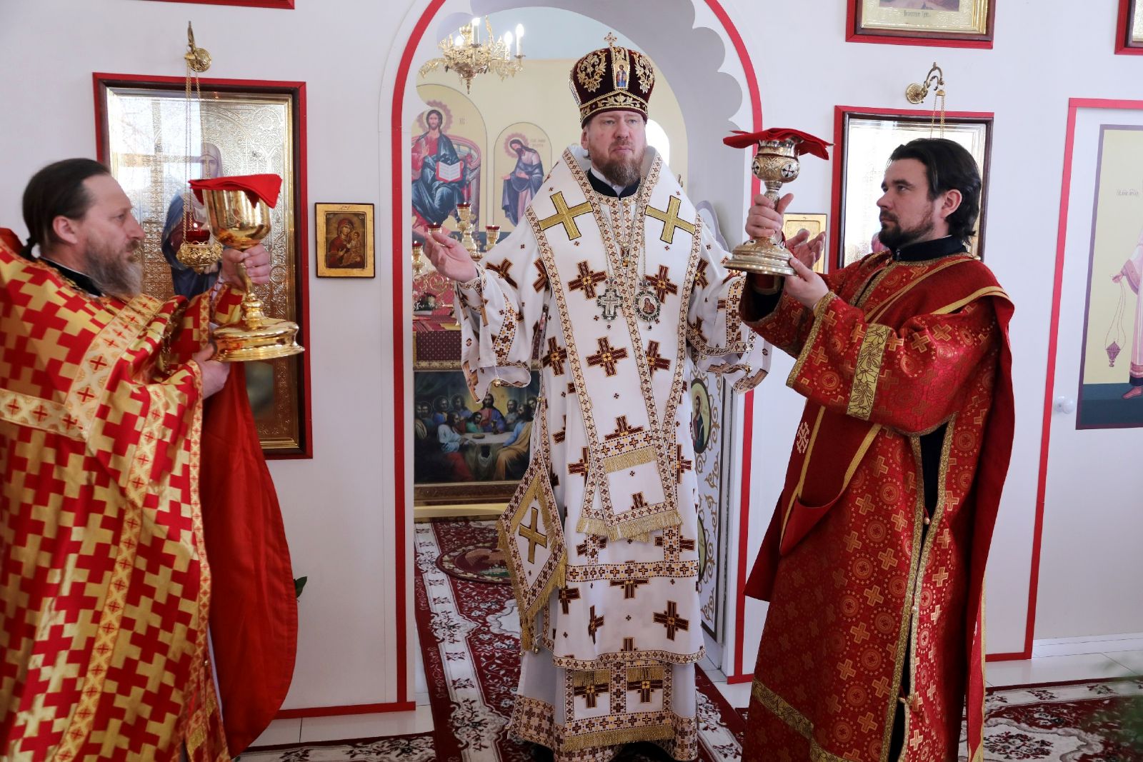 Его Высокопреосвященству сослужили: благочинный I Владивостокского благочиния, исполняющий обязанности благочинного II Владивостокского благочиния, настоятель храма святителя Спиридона Тримифунтского г. Владивостока, протоиерей Сергий Шуталев; настоятель храма новомучеников и исповедников Церкви Русской протоиерей Андрей Метелев; благочинный Лучегорского благочиния Владивостокской епархии, настоятель храма иконы Божией Матери Скоропослушница пгт. Лучегорска, протоиерей Димитрий Федорин; ответственный за организацию архиерейских богослужений в храмах Владивостокской епархии иерей Дионисий Ищенко.