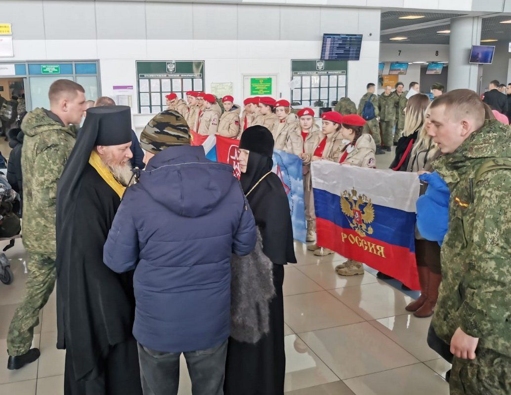Также монахини и послушницы монастыря собрали для воинов крестики, иконки, пояски с 90-м псалмом, молитвословы. Всего посылок из Раздольного – от монастыря и жителей – получилось более ста коробок. Вместе с юнармейцами Игумения Феодосия, несколько монахинь и игумен Филарет (Саяпин) 15 февраля, в день праздника Сретения Господня, поехали в аэропорт отправить гуманитарную помощь в зону СВО и проводить на фронт воинов. Монастырский священник в аэропорту по просьбам солдат исповедовал и даже крестил 30 человек. Игумения Феодосия и монахини беседовали с воинами, раздавали крестики, пояски с 90-м псалмом, молитвословы. Всех желающих помазывали миром от иконы «Победительная».