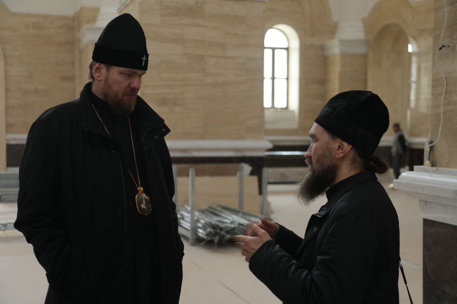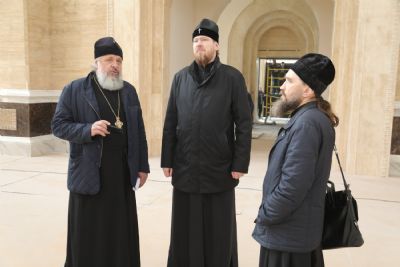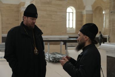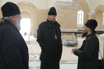 По завершении совещания архипастырь прошел по строительной площадке Спасо-Преображенского кафедрального собора, где ознакомился с ходом работ по установке дверей в храм, обсудил вопросы, связанные с росписью алтарных апсид, осмотрел помещения для певчих.