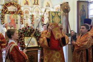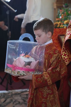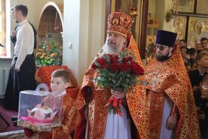 Настоятель храма протоиерей Игорь Талько от имени клира и прихожан поблагодарил владыку за архипастырский визит, поздравил с праздником Светлого Христова Воскресения и преподнес букет цветов и пасхальный кулич.