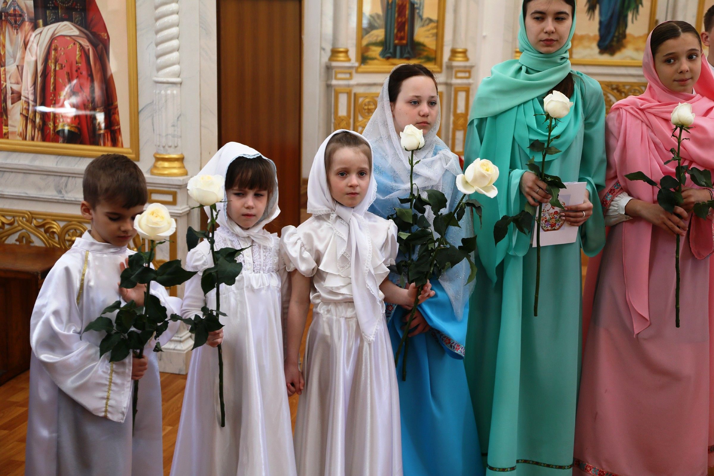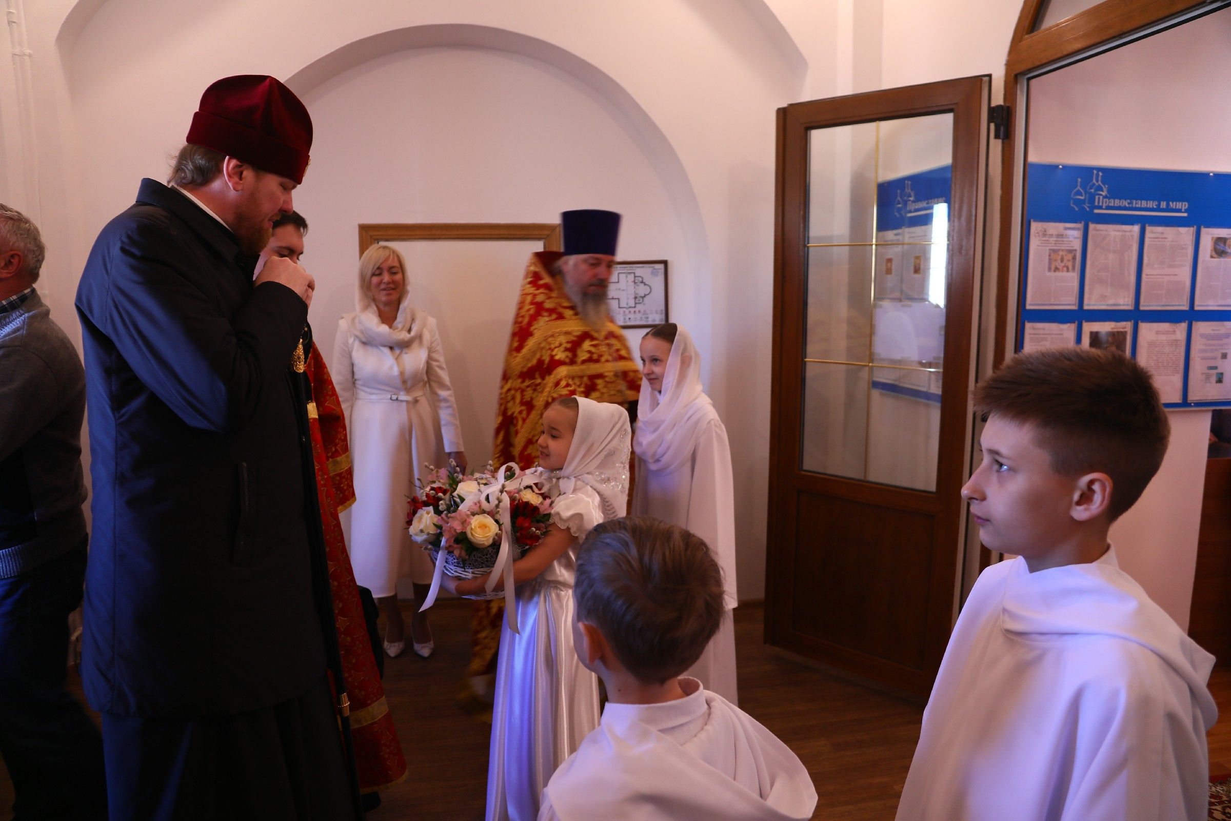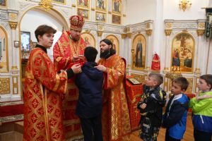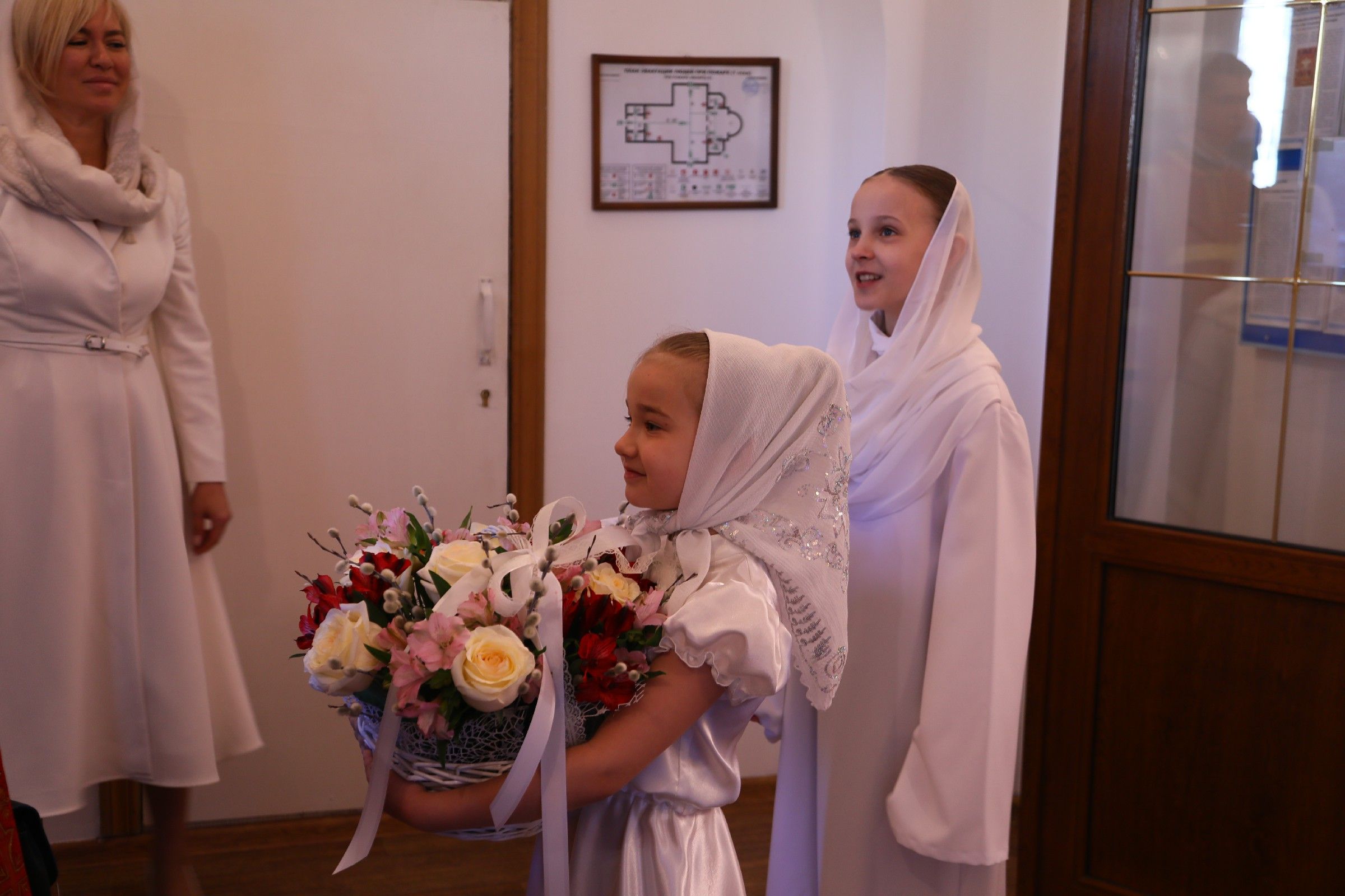 Митрополит Владимир вручил всем детям, присутствующим в храме, сладкие подарки и цветы преподавателям воскресной школы.