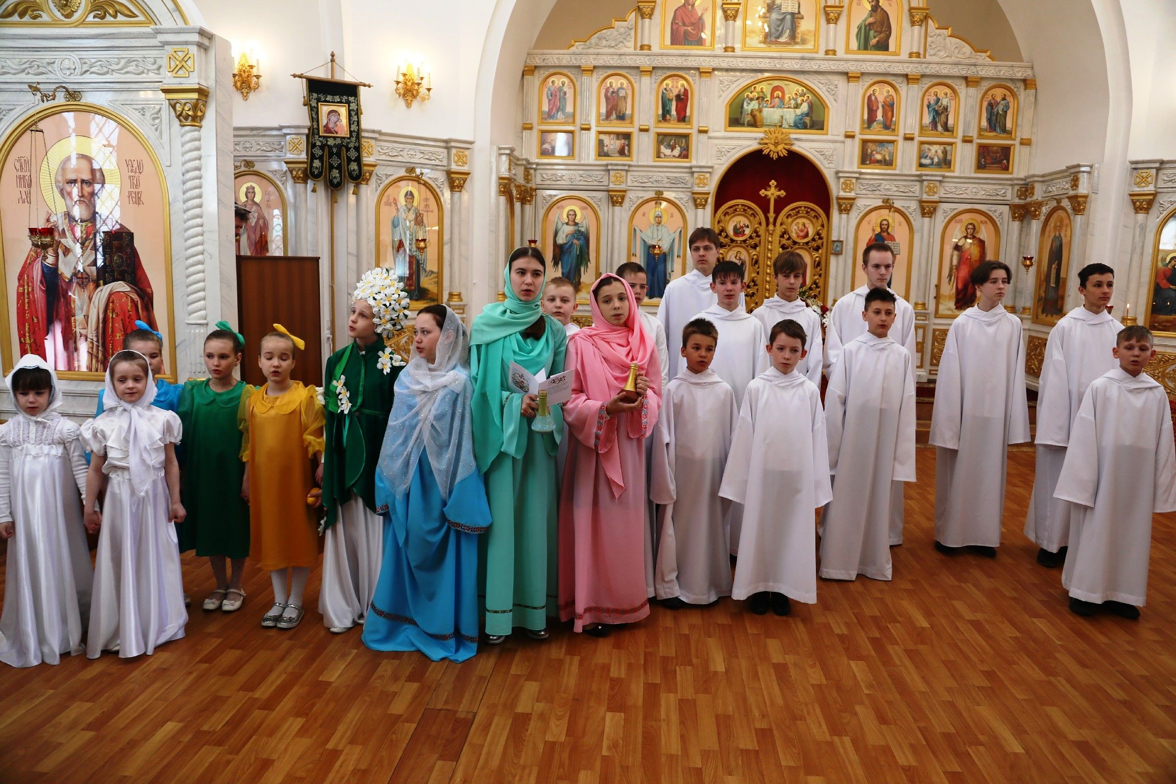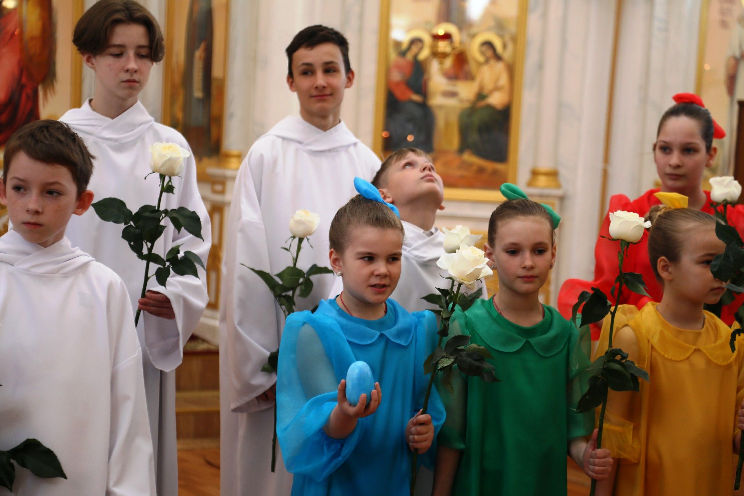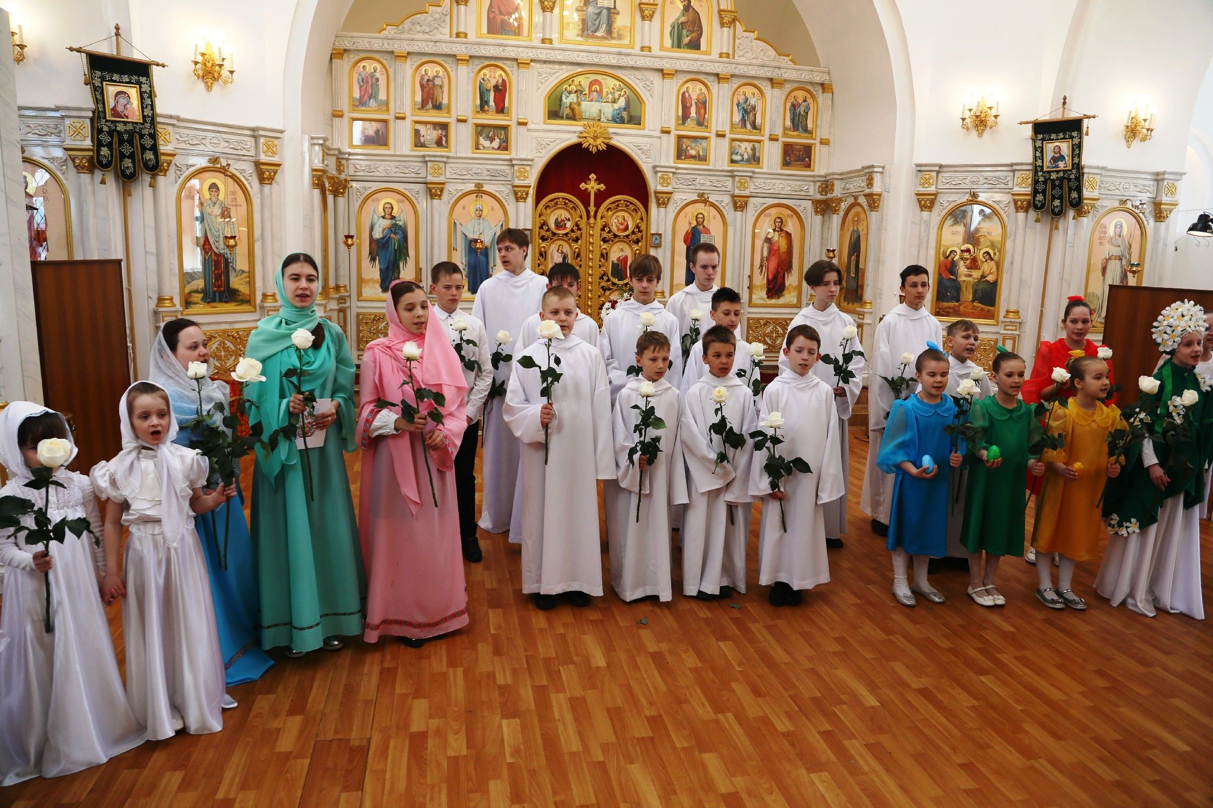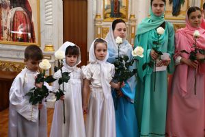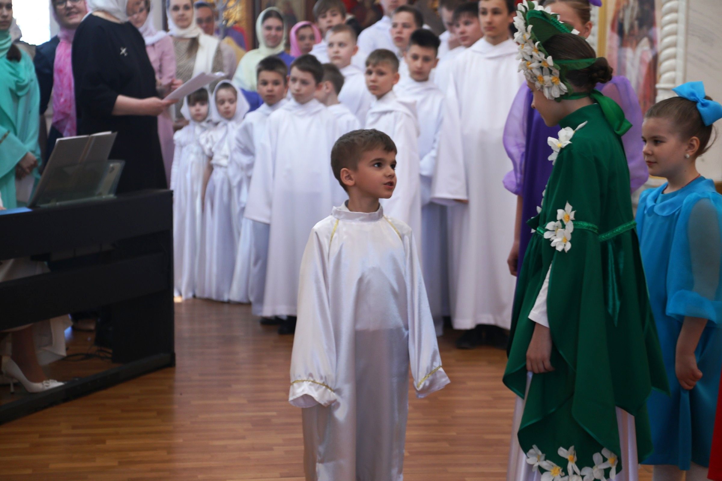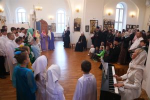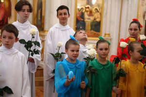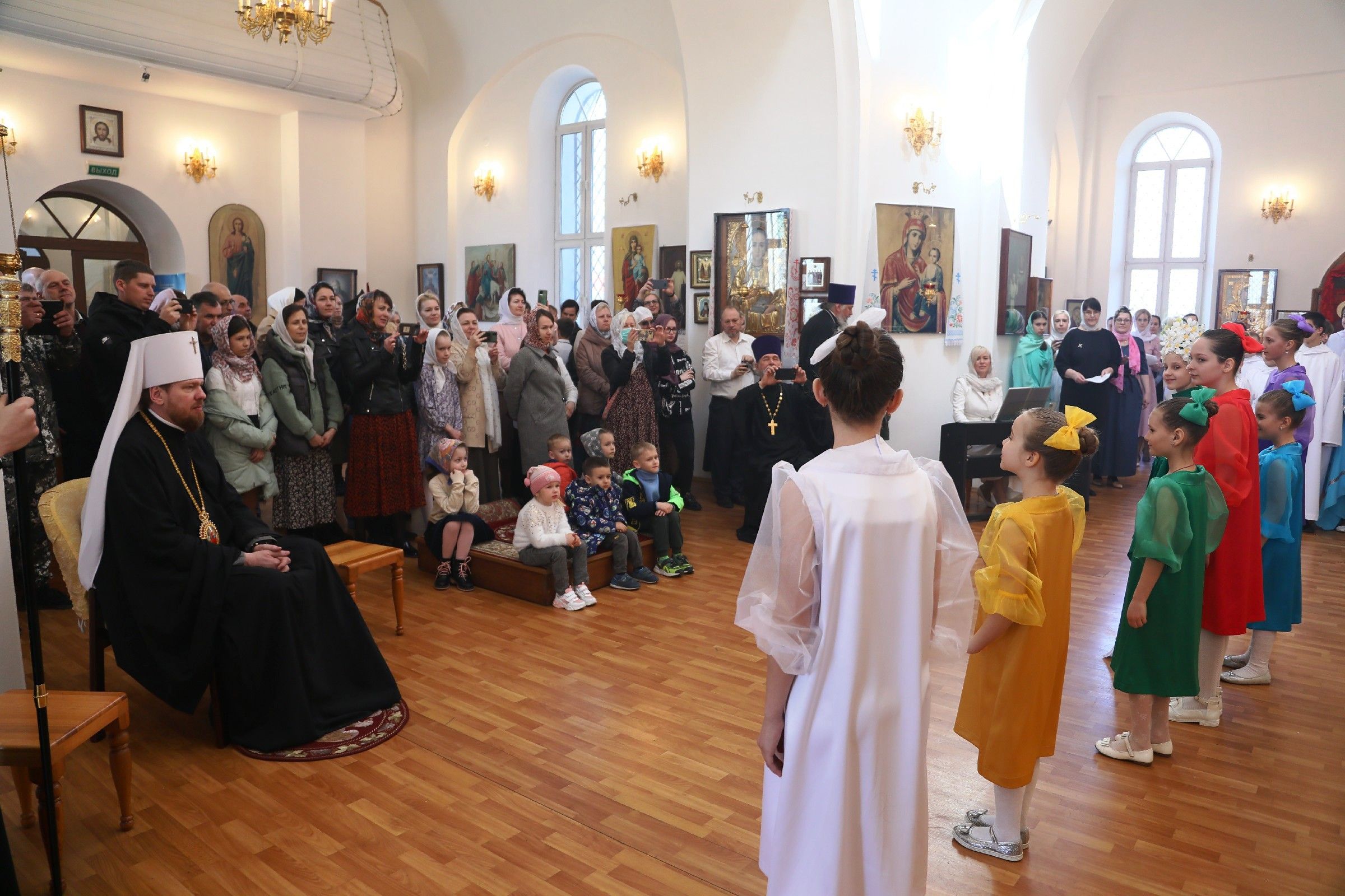 По окончании богослужения с поздравлением выступили воспитанники воскресной школы храма. Дети представили Пасхальный утренник: прочитали стихотворные поздравления, исполнили песнопения и преподнесли главе митрополии по цветку.