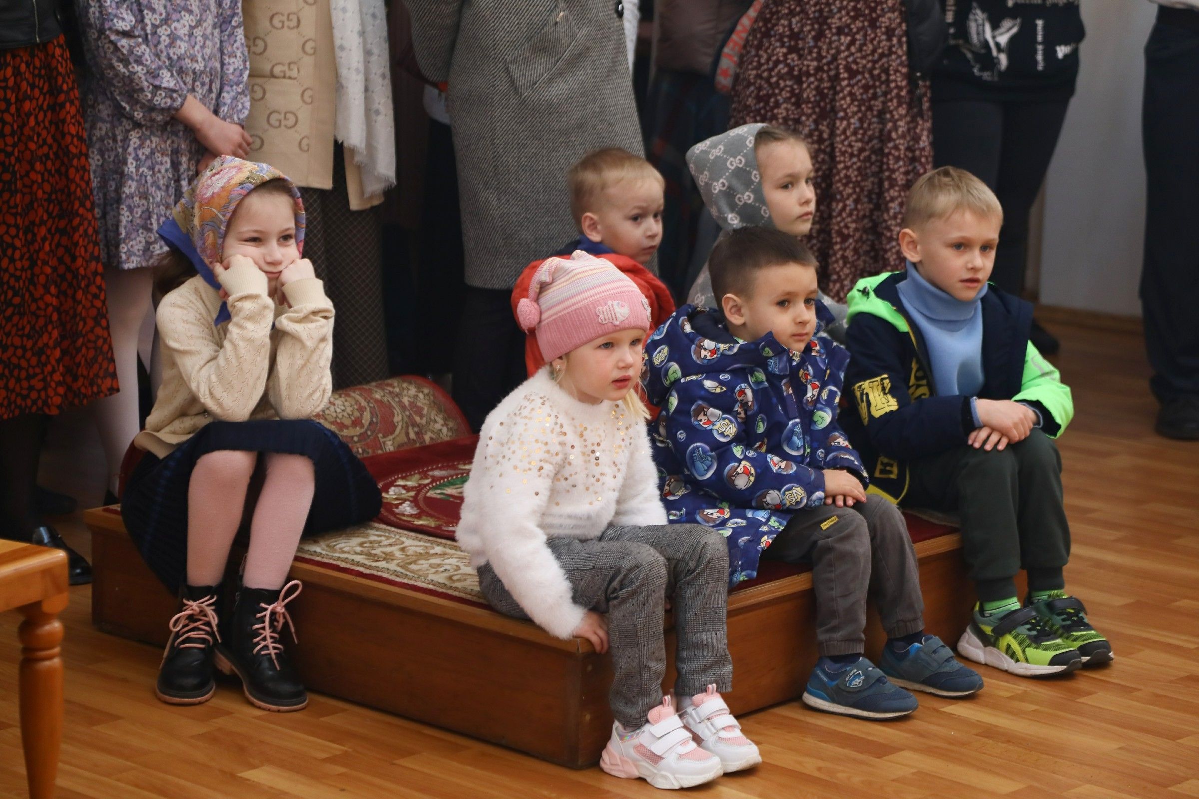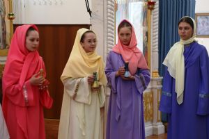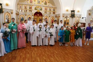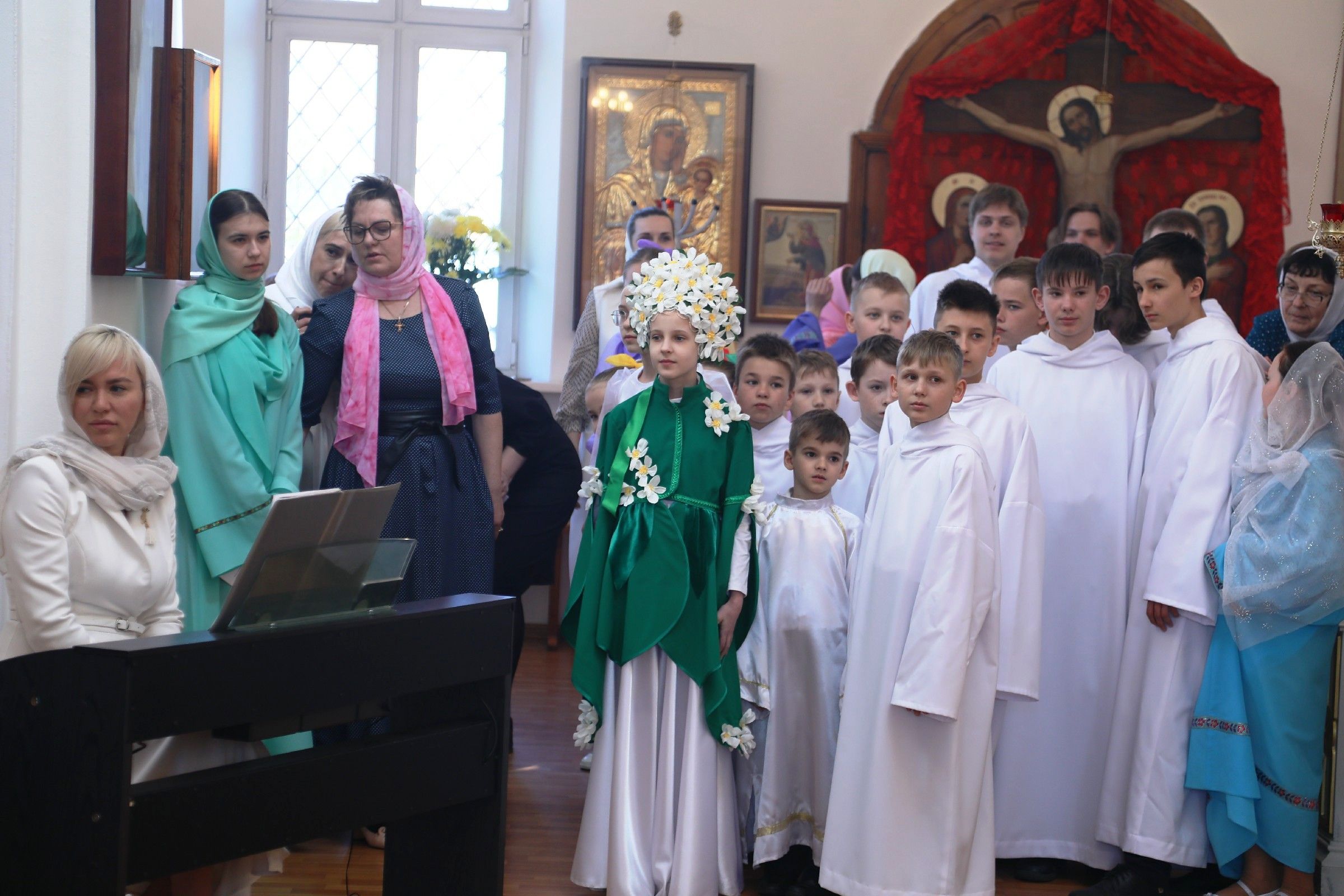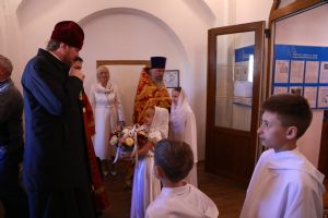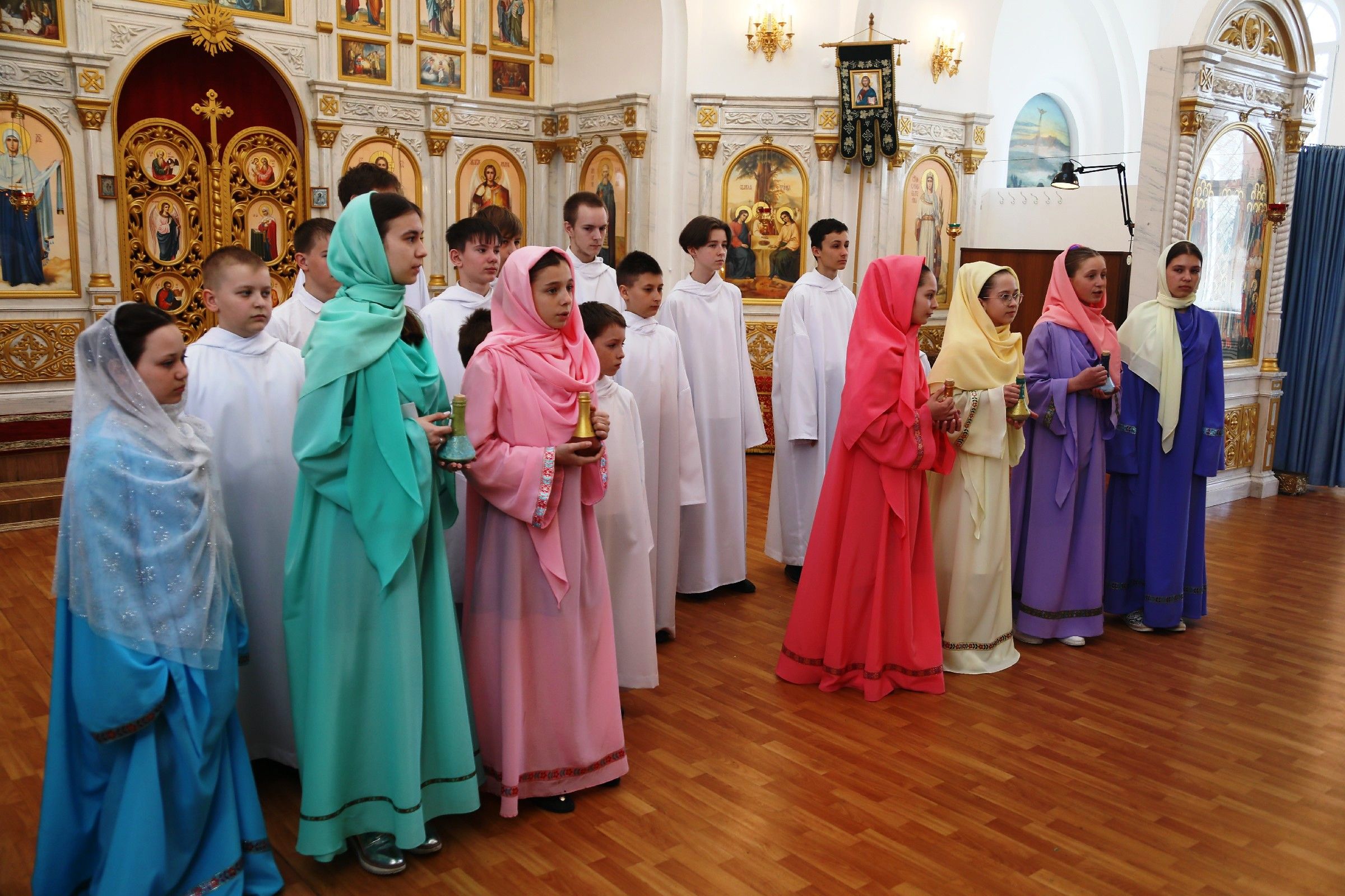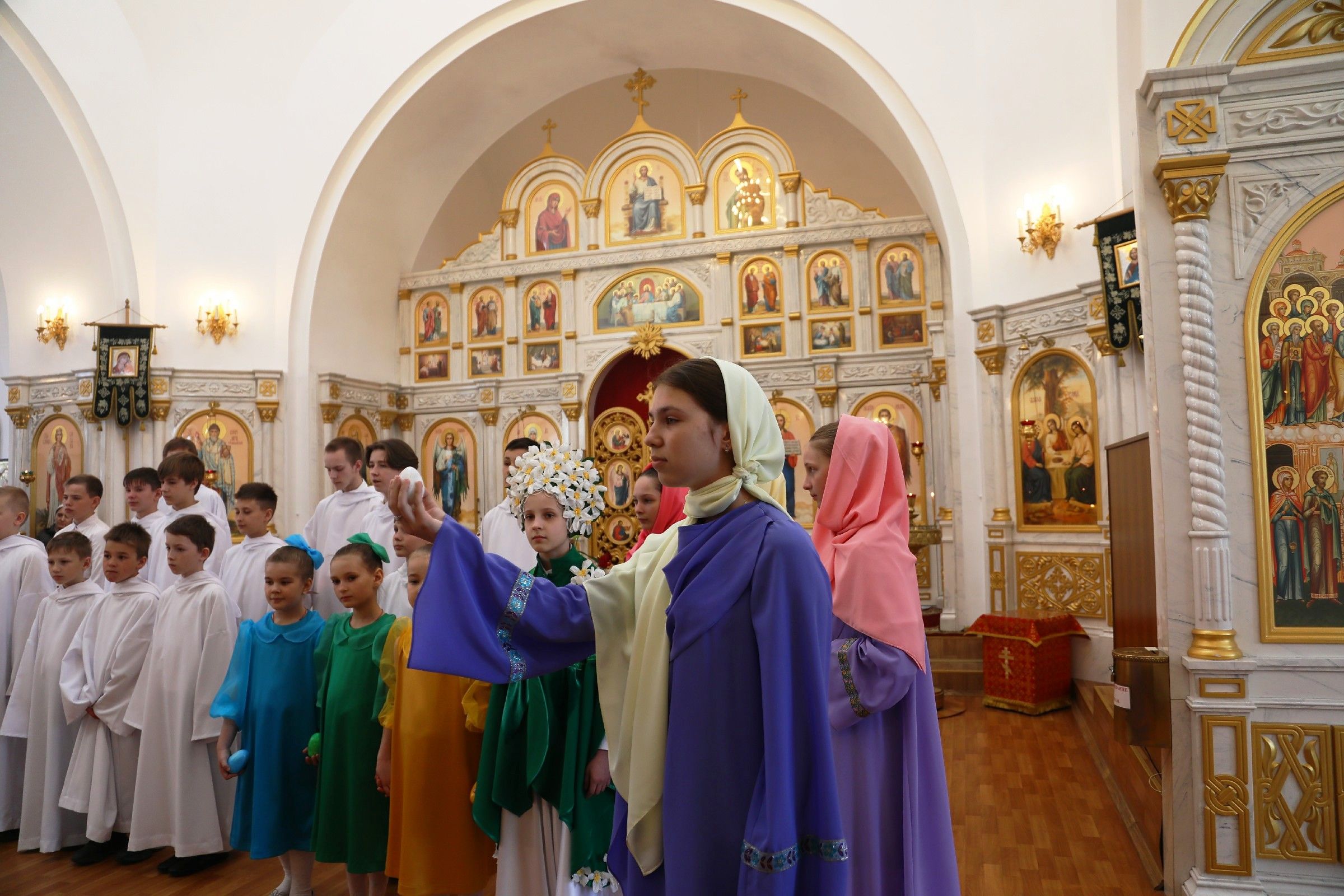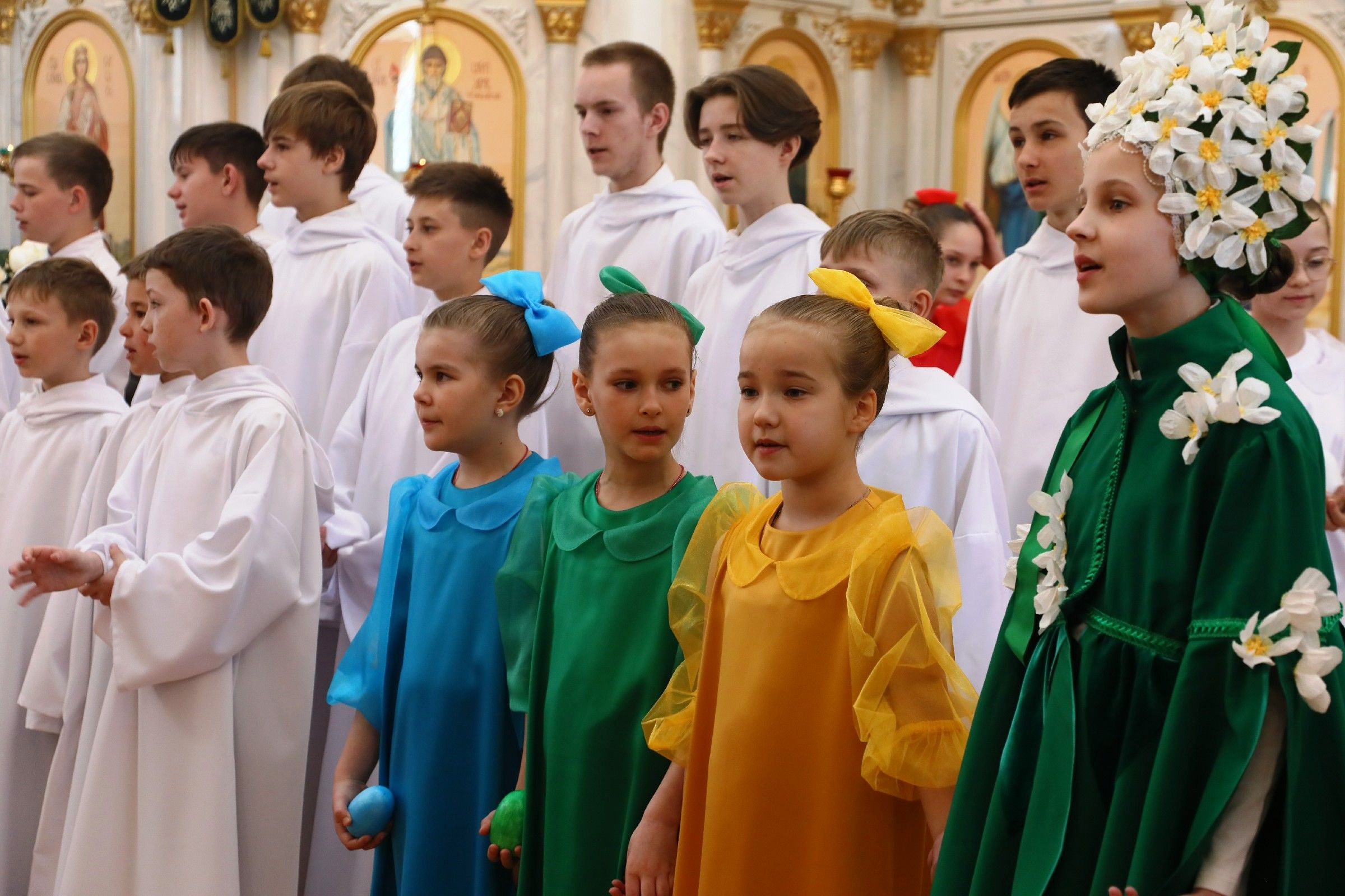 По окончании богослужения с поздравлением выступили воспитанники воскресной школы храма. Дети представили Пасхальный утренник: прочитали стихотворные поздравления, исполнили песнопения и преподнесли главе митрополии по цветку.
