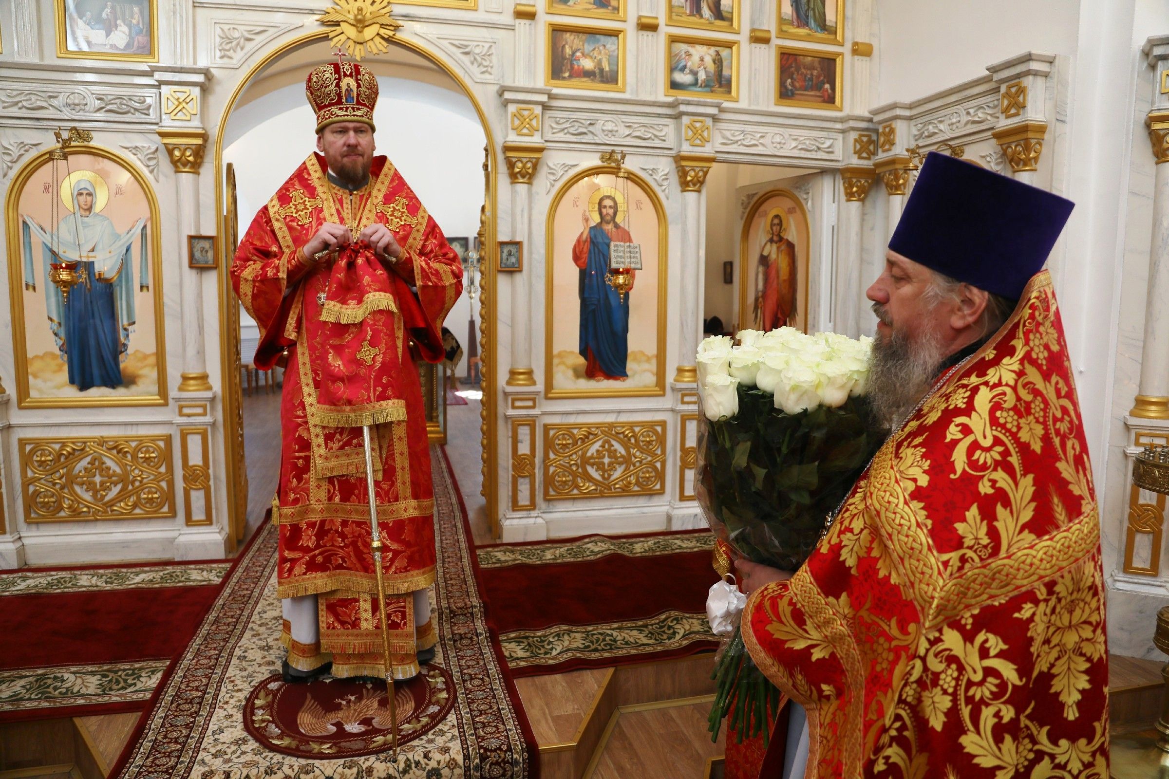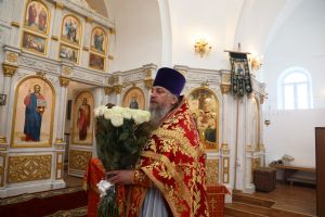 Настоятель храма протоиерей Сергий Бирюк от имени клира и прихожан поздравил митрополита Владимира с праздником Святой Пасхи и преподнес ему букет цветов.