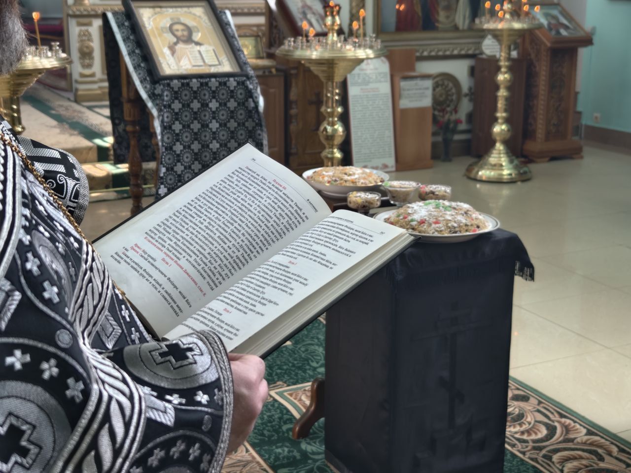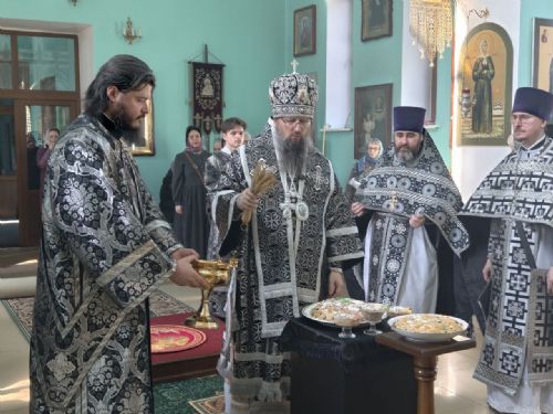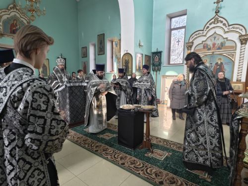 По завершении Литургии владыка в сослужении духовенства совершил чин молебного пения великомученику Феодору Тирону с освящением колива — традиционного постного блюда, напоминающего о чудесах святого.