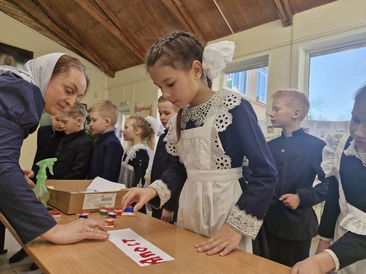 После торжественной части гостей ждали мастер-классы. Педагоги Надежда Шарамова и Анна Сосновенко научили детей азам печатного дела: вместе с митрополитом Павлом они создали оттиски названий древних книг.