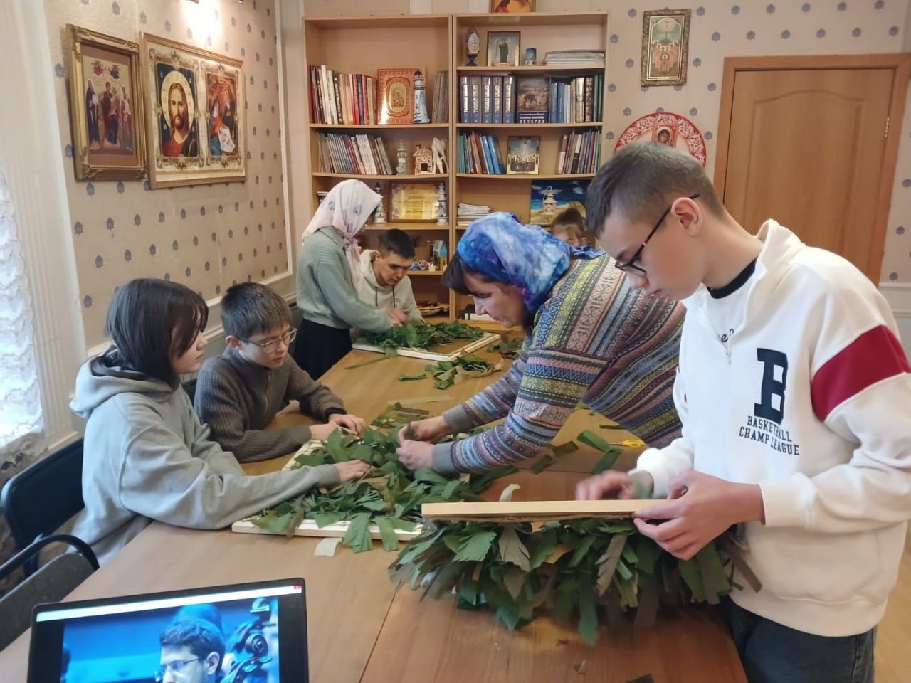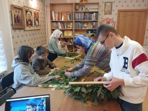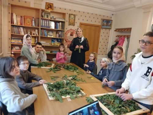 Ещё с середины марта ученики Воскресной школы после основных уроков плетут защитные сетки для воинов СВО. У некоторых ребят отцы проходят службу на СВО и они отмечают, что маскировочная сеть для солдата, который находится на позиции, не менее важна, чем бронежилет или каска. И каску тоже нужно маскировать сетью.