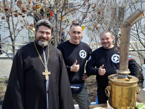 Братья и сестры "Русской общины" приготовили угощение на своей полевой кухне - горячую уху, прекрасный вкусный сбитень, угощали куличами и чаем из настоящего русского самовара, а также провели разного рода русские забавы с детьми и взрослыми.