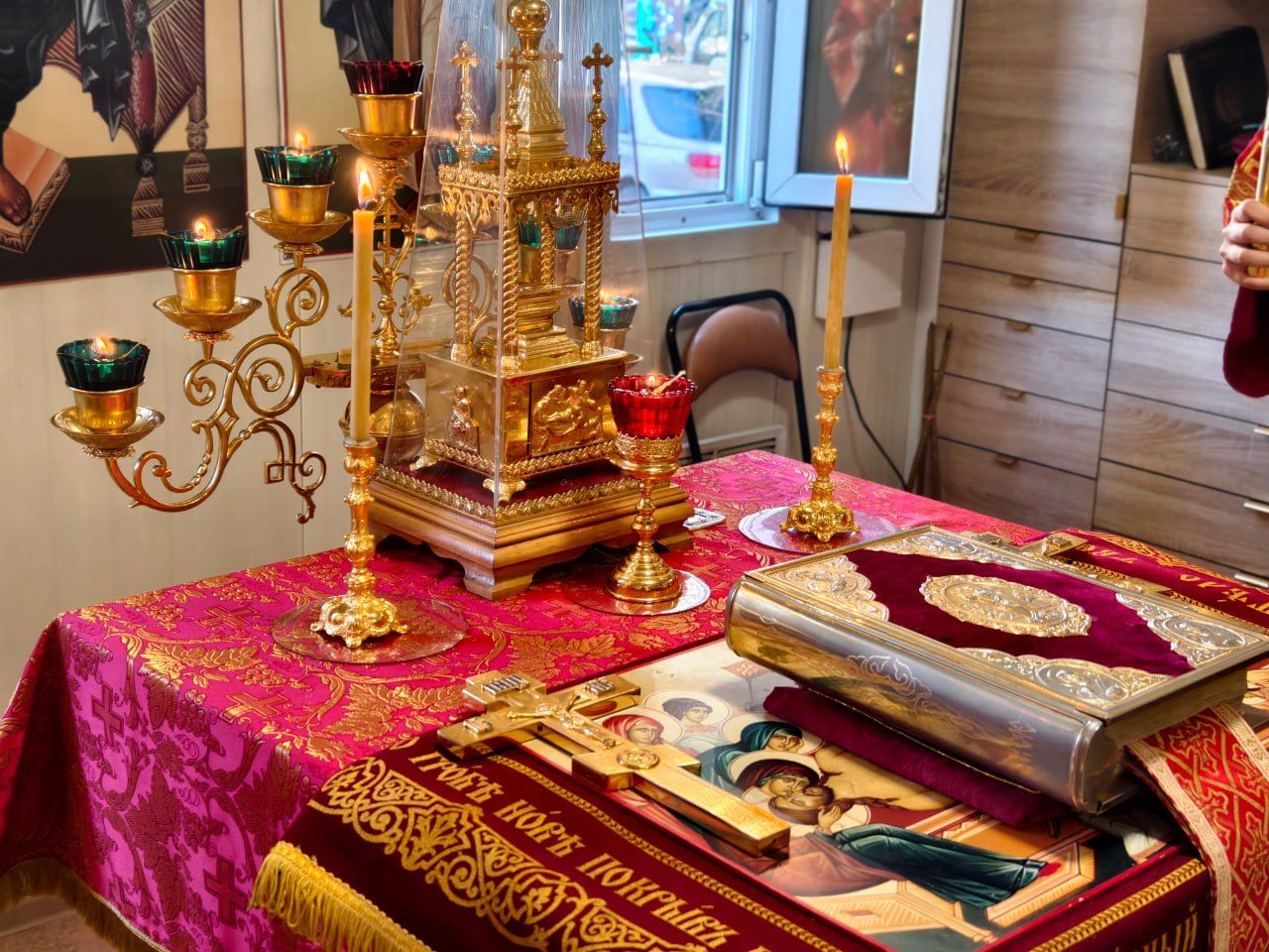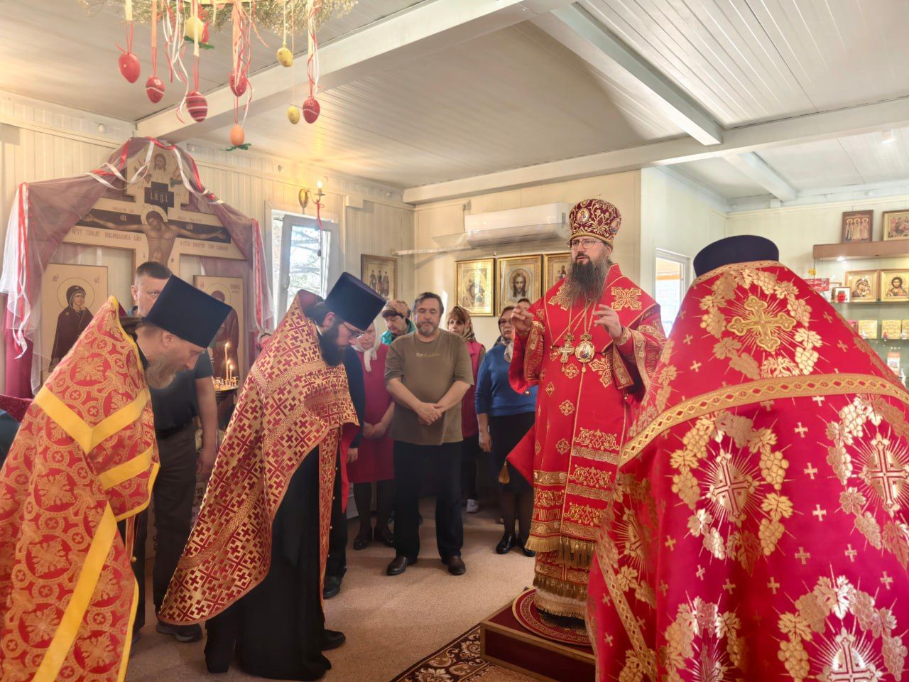 Даже в скромном помещении временного храма богослужение возводит молящихся за границы земного бытия. Воскресший Христос Господь прославляется пасхальными песнопениями. Вновь звучит Пасхальный канон, в третьей песне которого Церковь исповедует бессмертие, которое Своей крестной жертвой Христос приобрёл для всех верующих в Него: