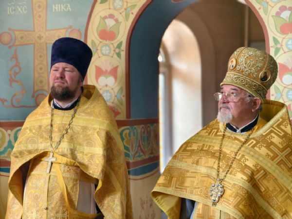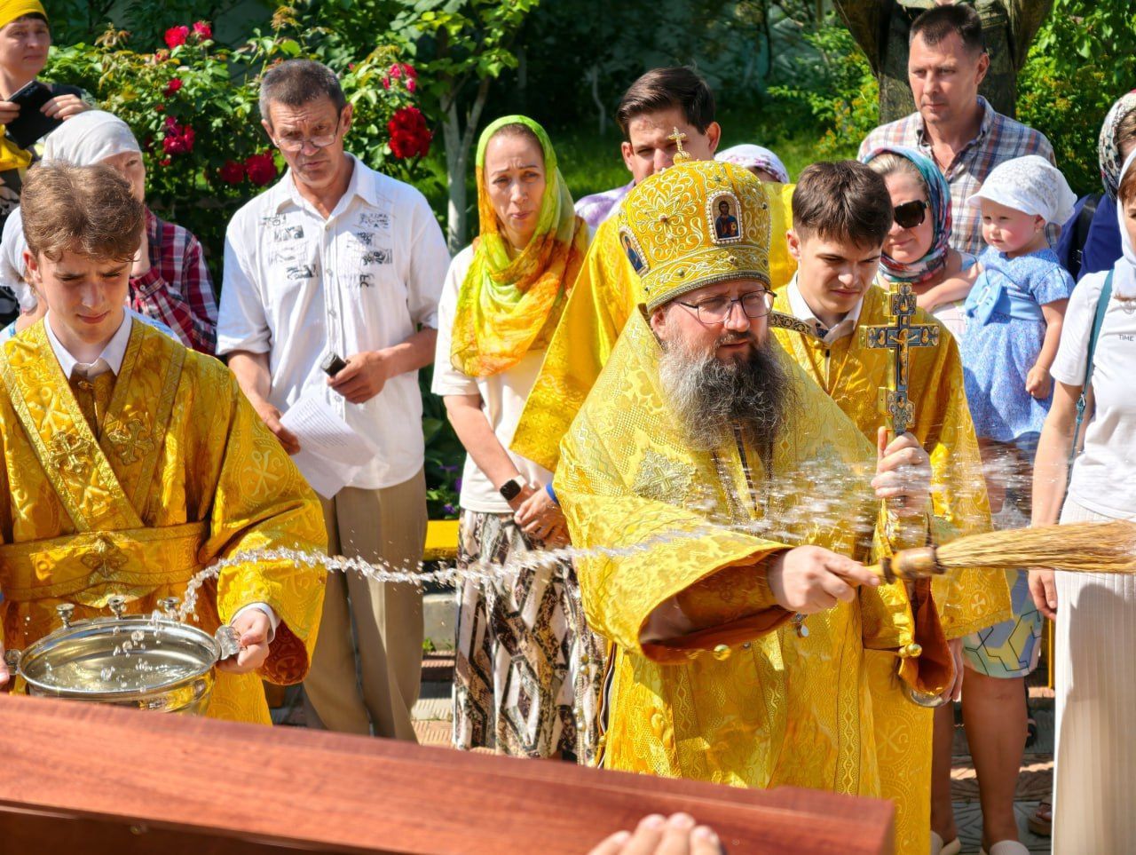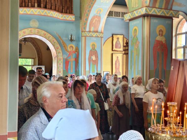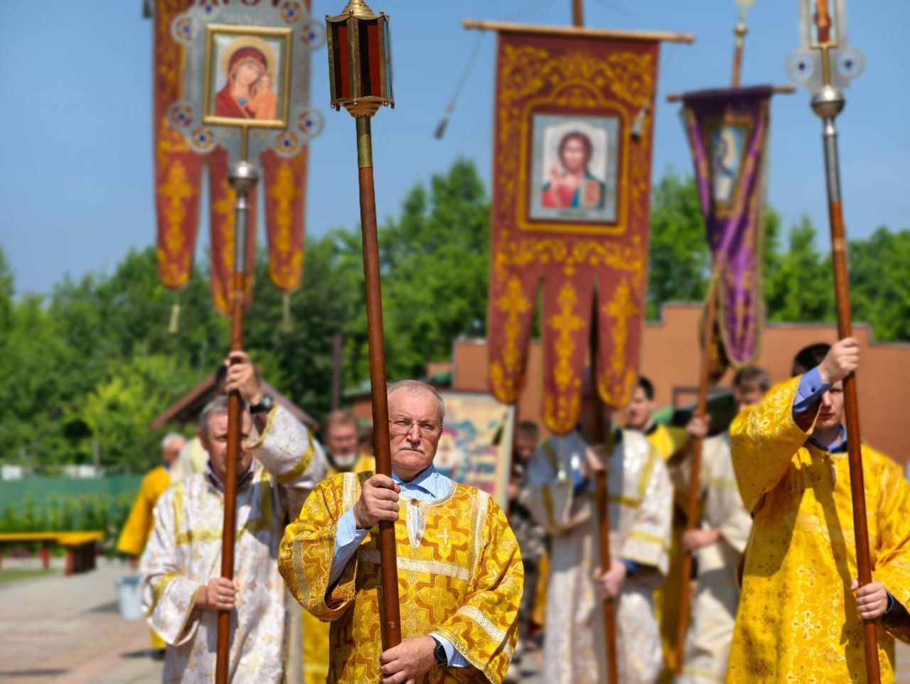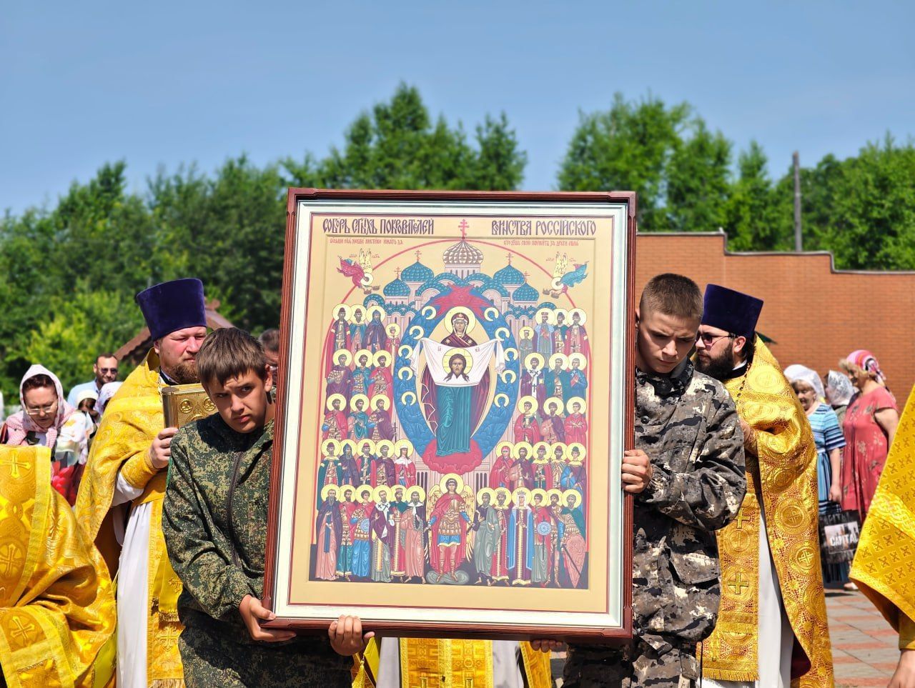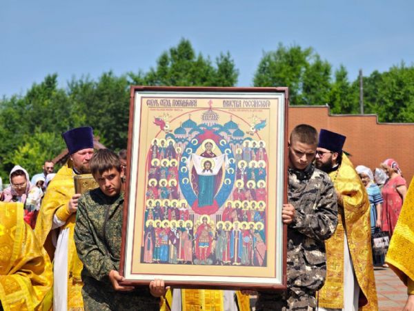 Богослужение, соединяющее Церковь земную и небесную, происходило перед иконой Святых покровителей воинства Российского, прибывшей сюда крестным ходом накануне. После отпуста владыка Павел, духовенство и все присутствовавшие совершили молебен перед святым образом, а затем торжественное молитвенное шествие вокруг храма. На остановках читалось зачало из Евангелия, а верующие окроплялись святой водой.