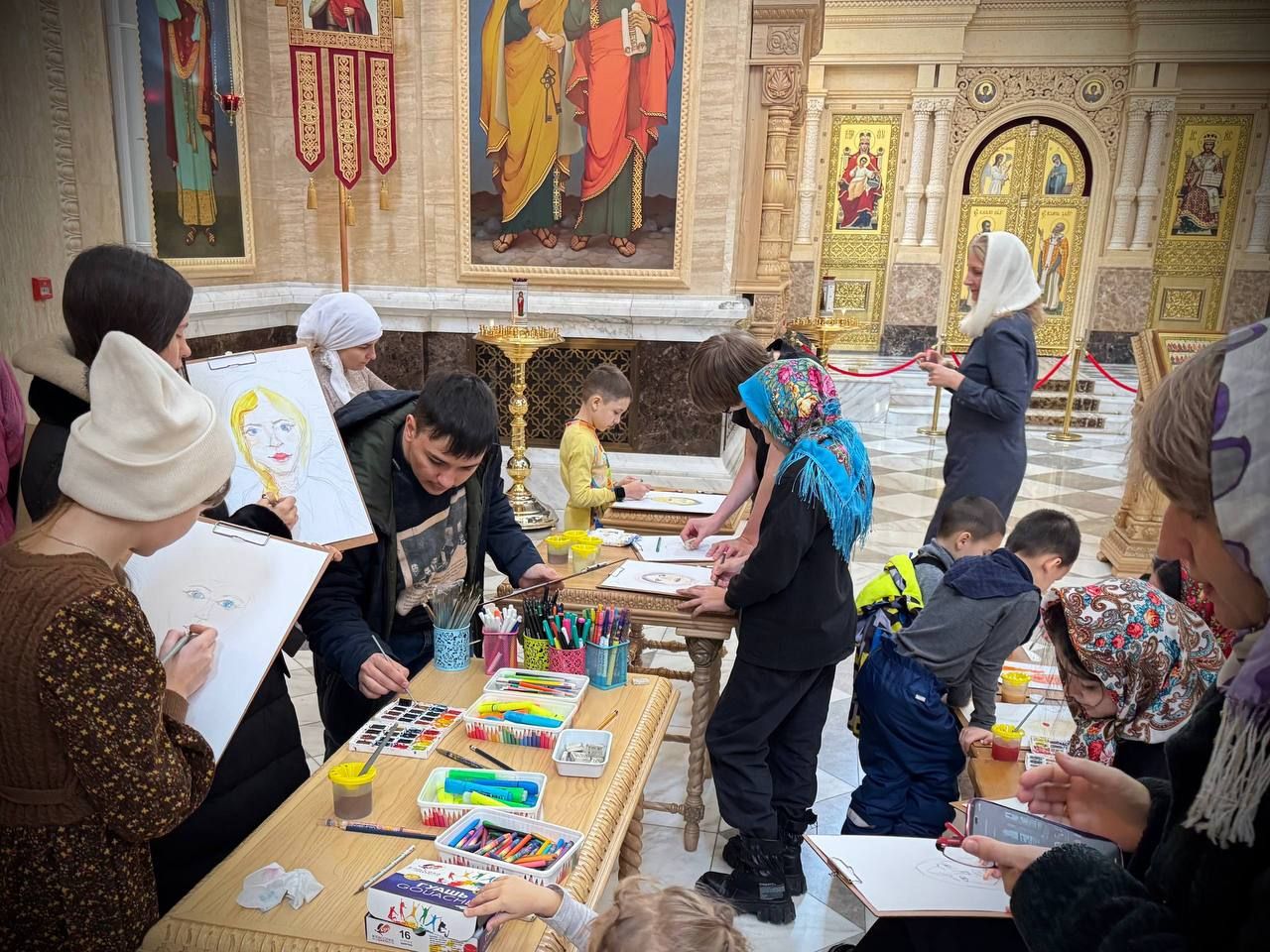 Завершилось мероприятие чаепитием в трапезной и непринуждённой беседой о семье, доме и храме. Дети преподнесли своим мамам их портреты.