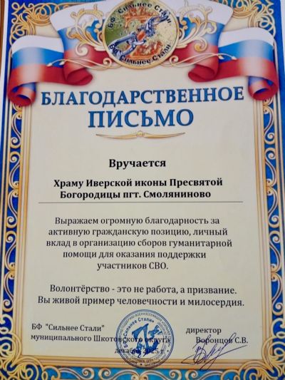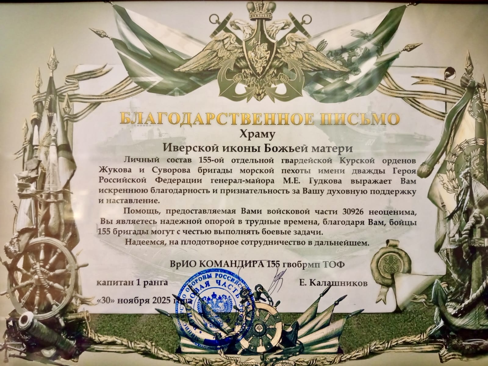 Также в честь дня Волонтёра Приходу храма Иверской иконы Пресвятой Богородицы были вручены благодарственные письма от войсковой части 155 бригады морской пехоты и Благотворительного Фонда "Сильнее Стали".