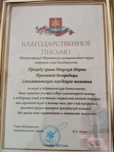 В День волонтера 5 декабря 2025 года в Доме культуры села Романовка состоялось торжественное мероприятие, на котором были вручены благодарственные письма от главы Шкотовского округа Носова В.А. Такой наградой был отмечен Приход храма Иверской иконы Пресвятой Богородицы пгт. Смоляниново (настоятель иерей Алексий Пикулин).