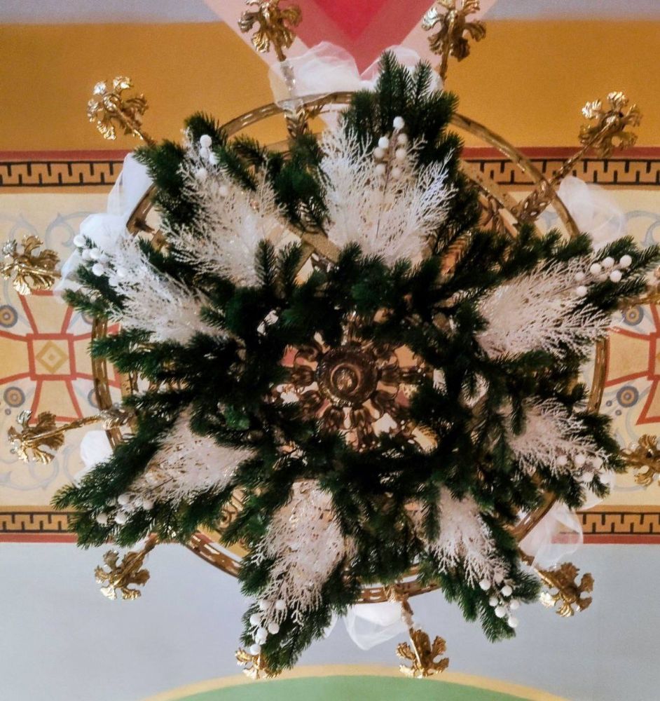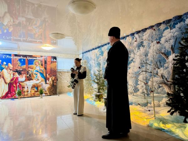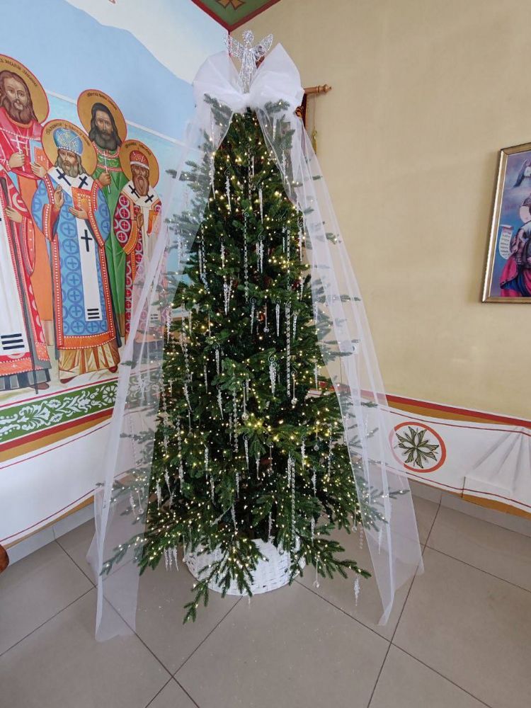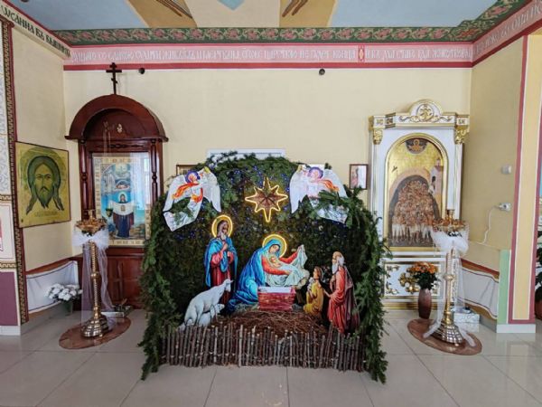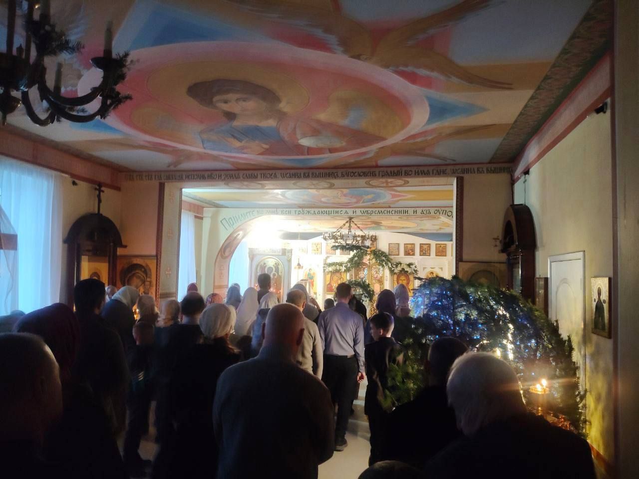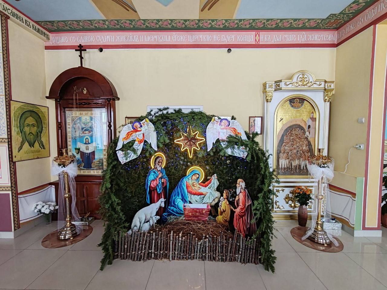 К Рождеству Христову храм был нарядно украшен: в центре установлен вертеп, елка сверкала тысячами огоньков, а Царские врата были обрамлены гирляндами из еловых ветвей.