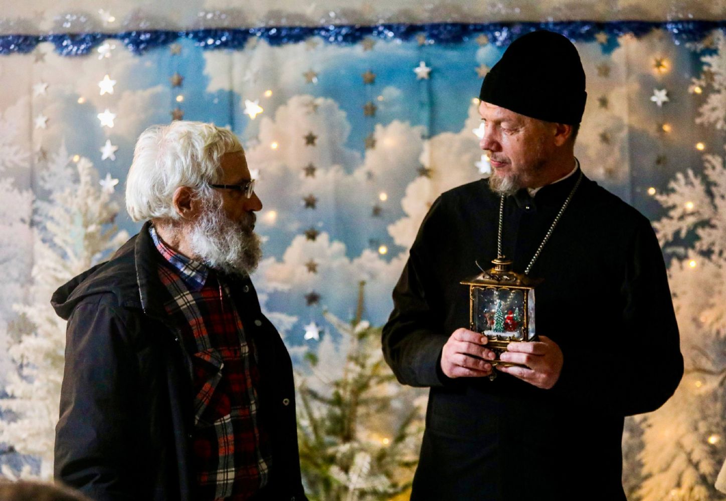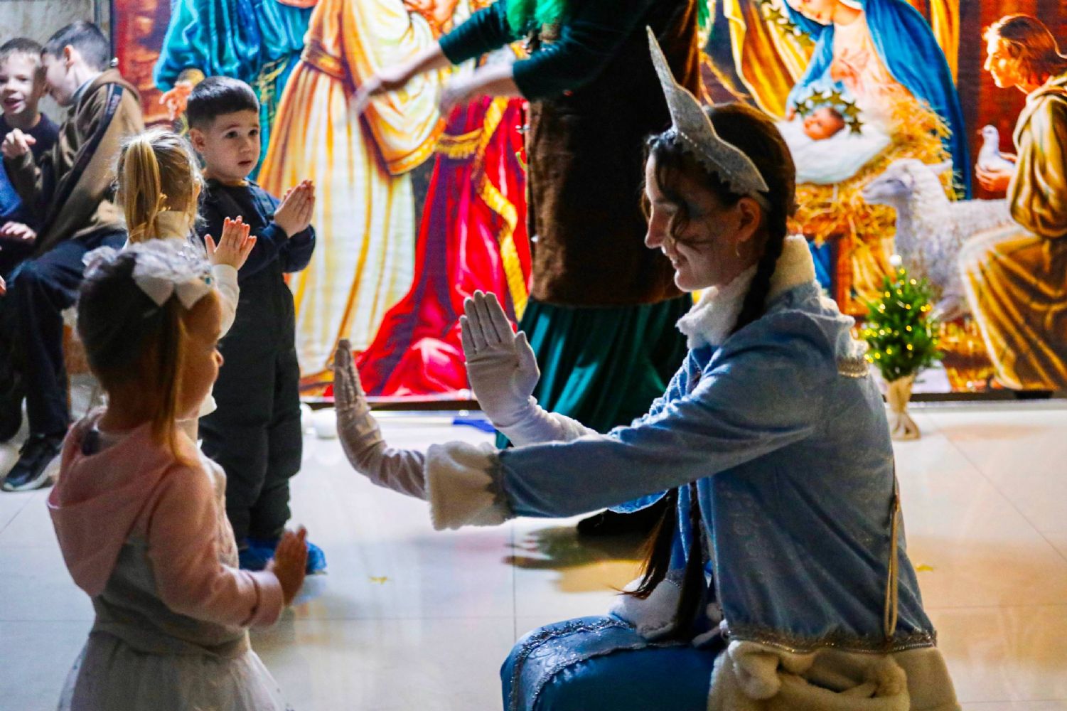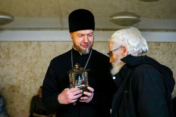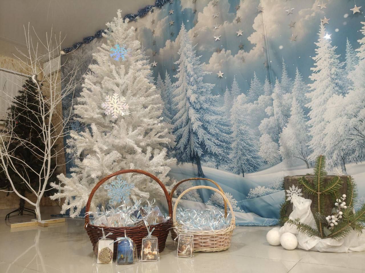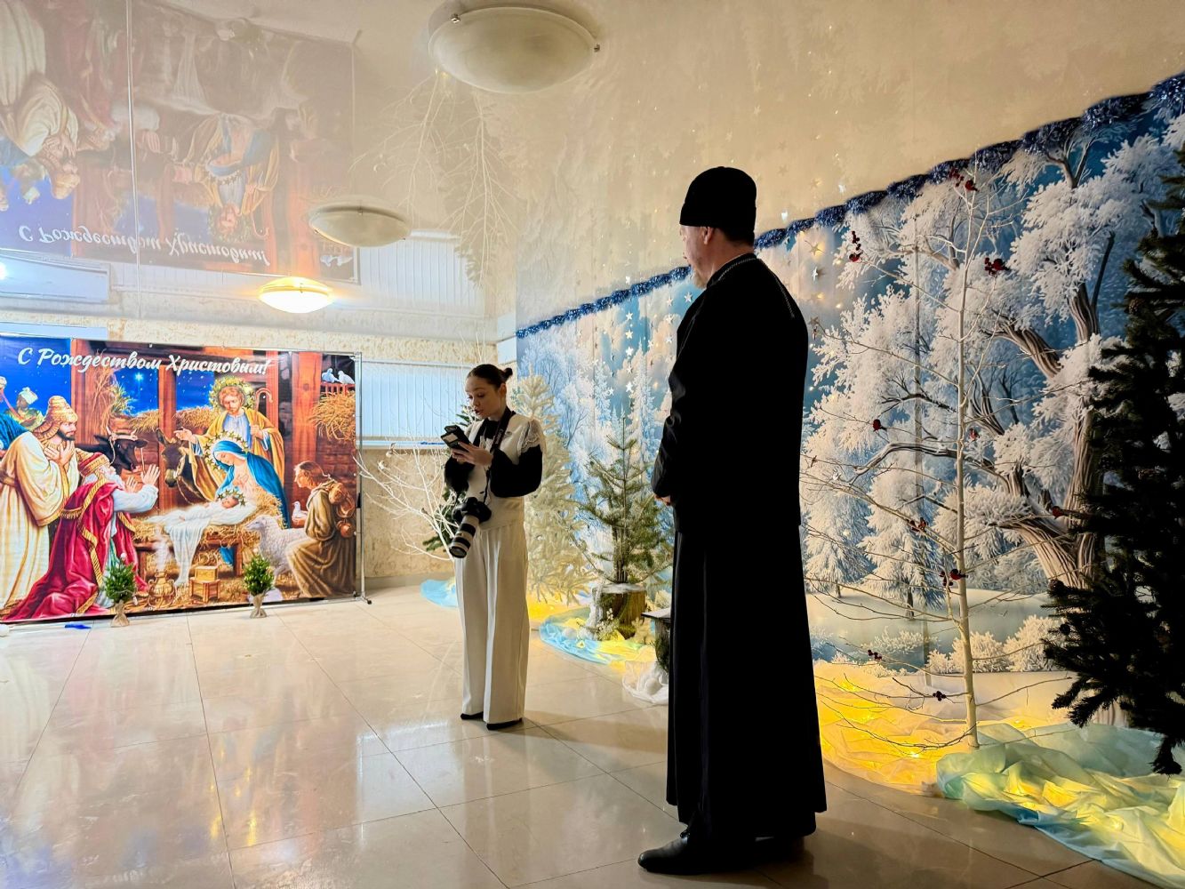 К Рождеству Христову храм был нарядно украшен: в центре установлен вертеп, елка сверкала тысячами огоньков, а Царские врата были обрамлены гирляндами из еловых ветвей.
