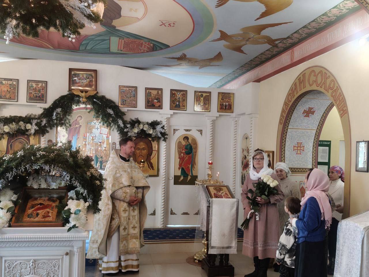 Литургию престольного праздника совершил настоятель храма протоиерей Анатолий Колесников. По окончании богослужения прихожане поздравили батюшку с праздником Рождества Христова и вручили букет белых роз. К поздравлениям также присоединились общины молитвенной комнаты с. Барабаш и храма свт. Николая Чудотворца п. Краскино, окормляемые отцом Анатолием.