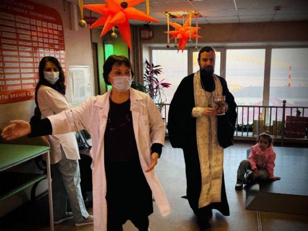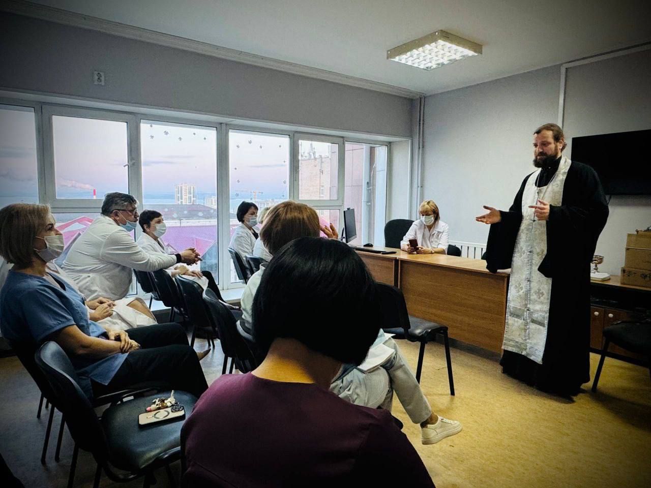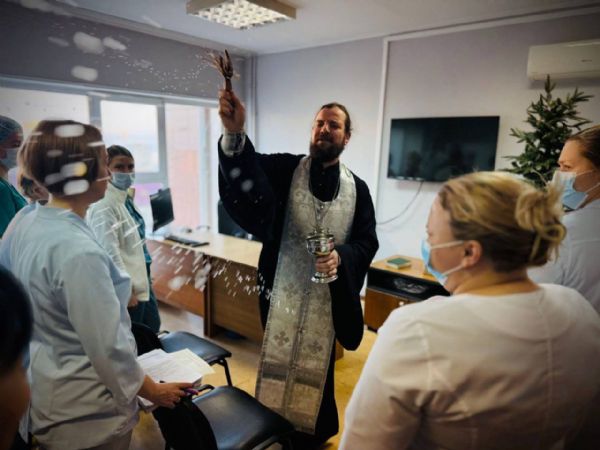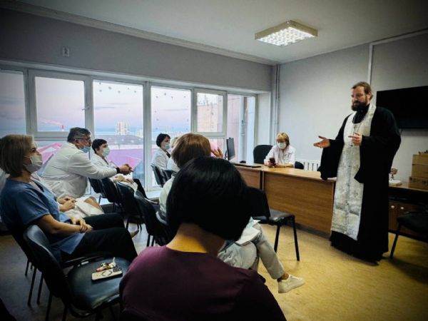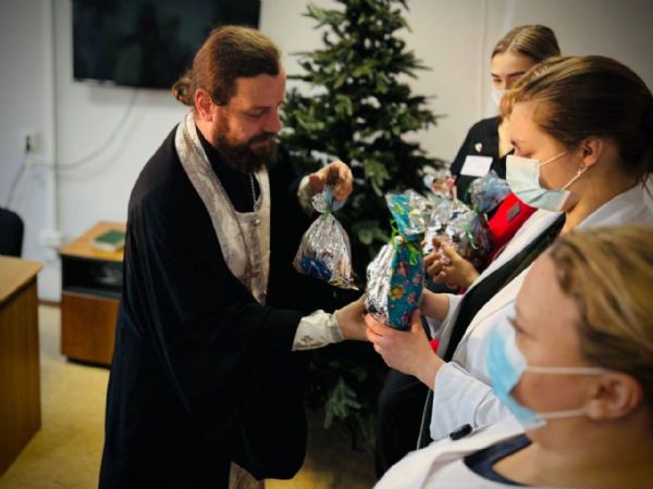 Встреча началась с беседы отца Владимира с главным врачом Анастасией Худченко и медицинским персоналом. Священнослужитель рассказал о глубоком смысле праздников Рождества Христова и Крещения Господня, ответил на вопросы врачей, касающиеся веры, и поблагодарил медиков за их благородный и самоотверженный ежедневный труд.