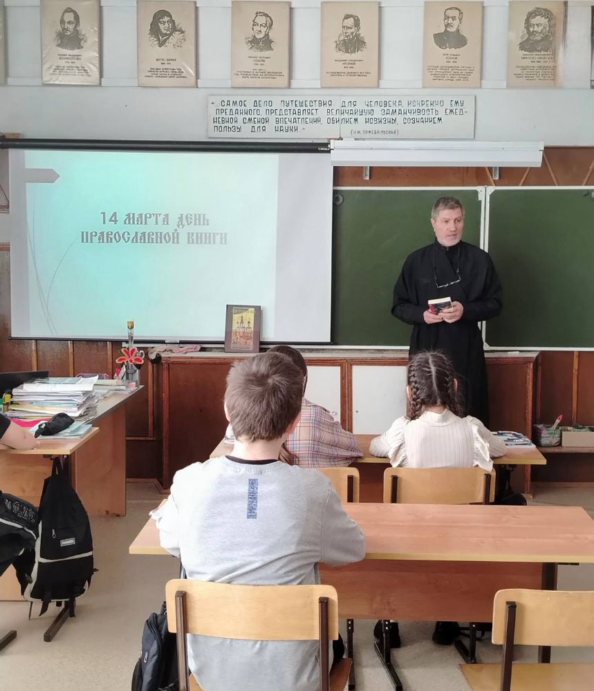 Гостем урока стал клирик храма Святого преподобного Алексия Человека Божия с. Камень-Рыболов диакон Виктор Воробьёв. Он рассказал школьникам о том, что такое православная книга, какое значение она имеет для каждого христианина и чем отличается от обычной художественной литературы. Особое внимание было уделено духовному содержанию и воспитательной роли православной литературы.