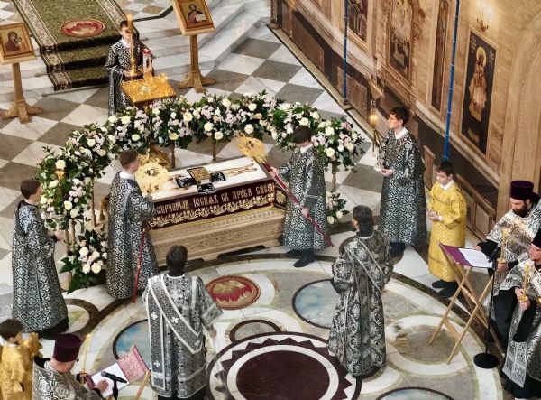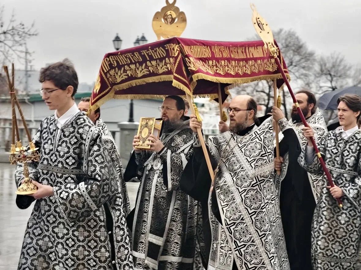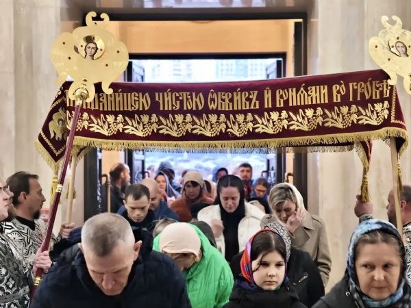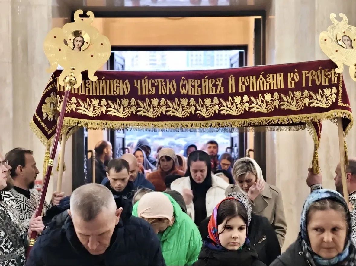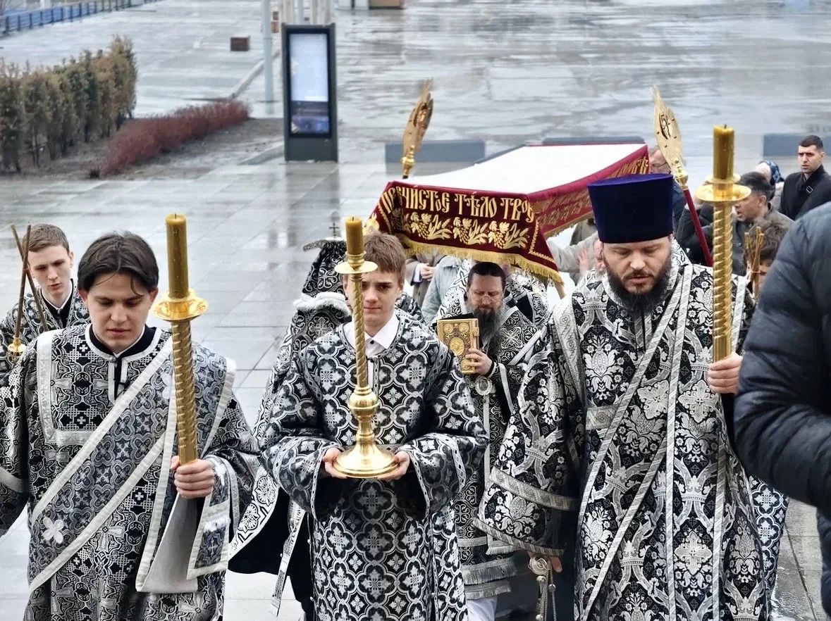 После Великого славословия перед плащаницей, под пение «Святый Боже» священнослужители подняли плащаницу и во главе с владыкой прошествовали вокруг храма. Сонм духовенства, клира и мирян совершил крестный ход с плащаницей, который символизирует погребение Христа и позволяет всем верующим стать соучастниками этого трагического, но спасительного события.