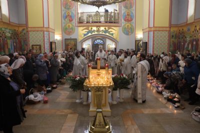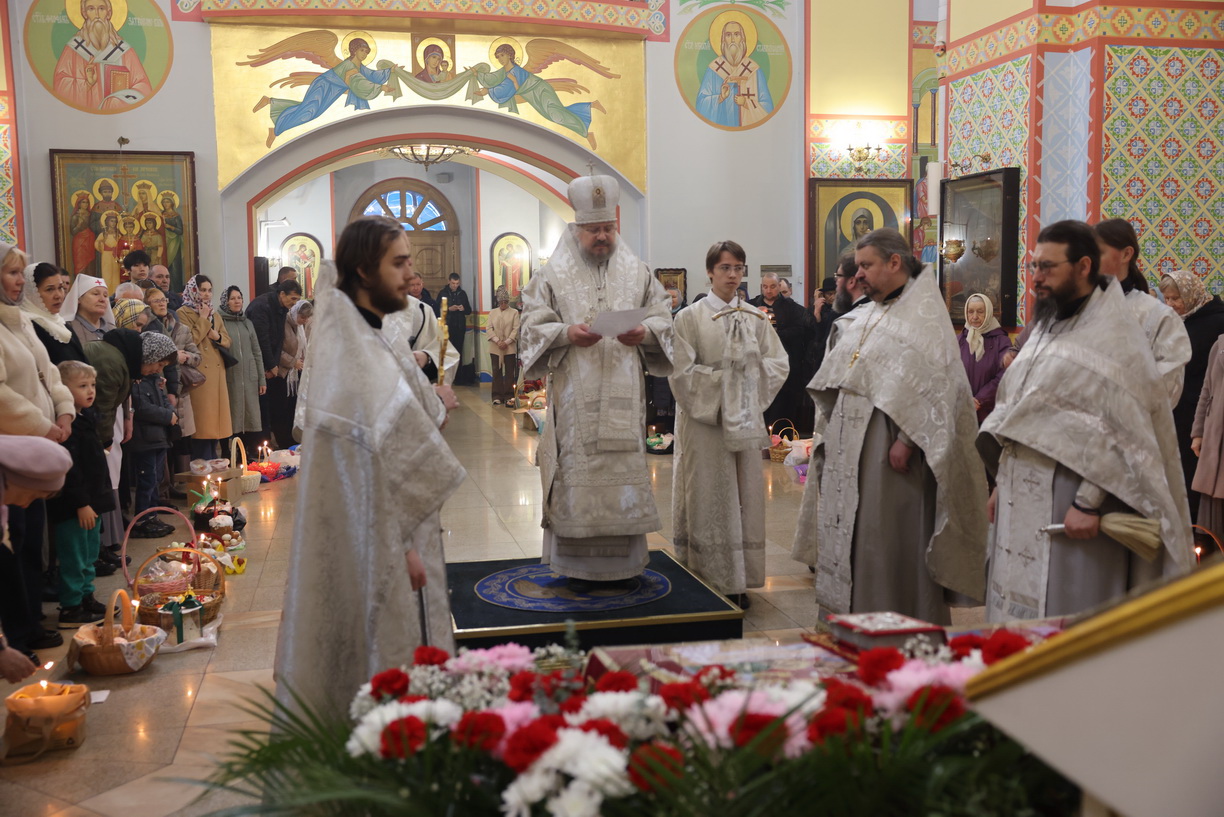 После отпуста Литургии архипастырь совершил, предписанное богослужебным Уставом, благословение хлебов и вина. Это благословение ежегодно совершается в память о том, как древние христиане, оставаясь в храме после Литургии до Пасхальной утрени, вкушением освященных хлеба и вина подкрепляли себя на подвиг бдения в эту священную и спасительную ночь.