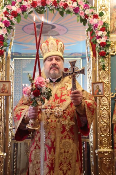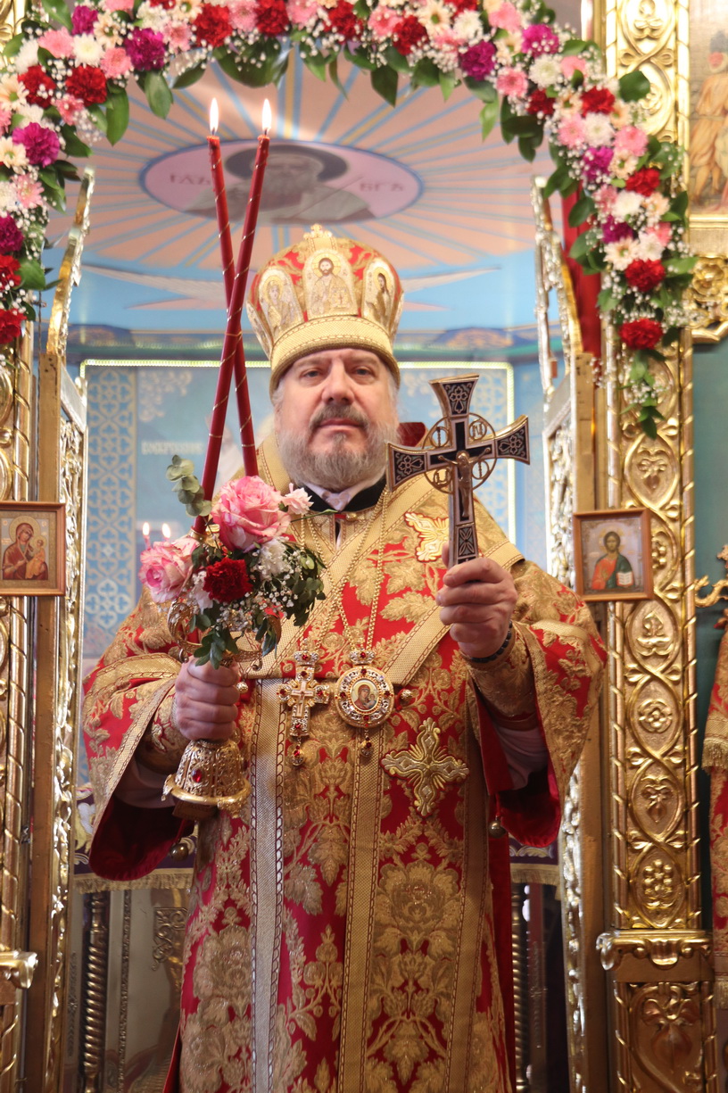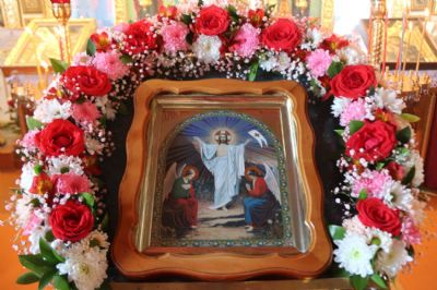 По замвонной молитве, епископ Николай возглавил праздничный пасхальный крестный ход и обратился к прихожанам храма с архиерейским словом, в котором поздравил всех с Пасхой Христовой.