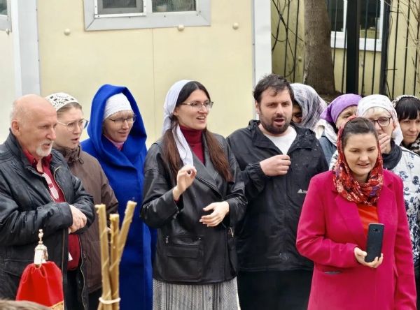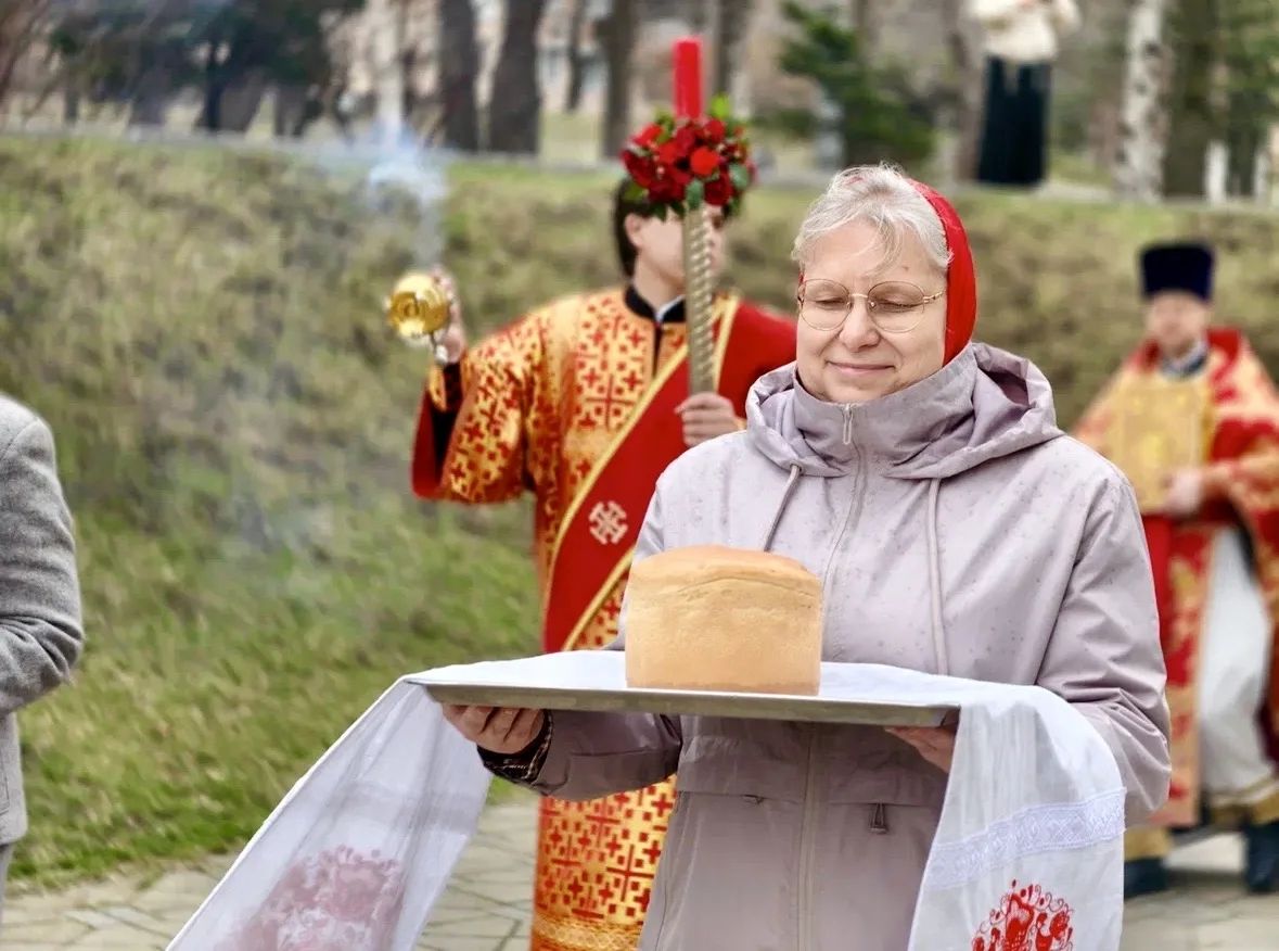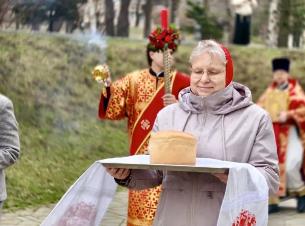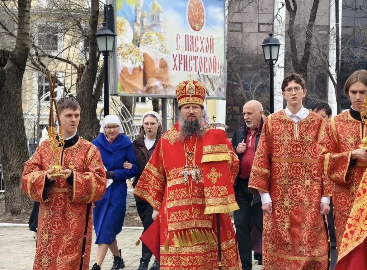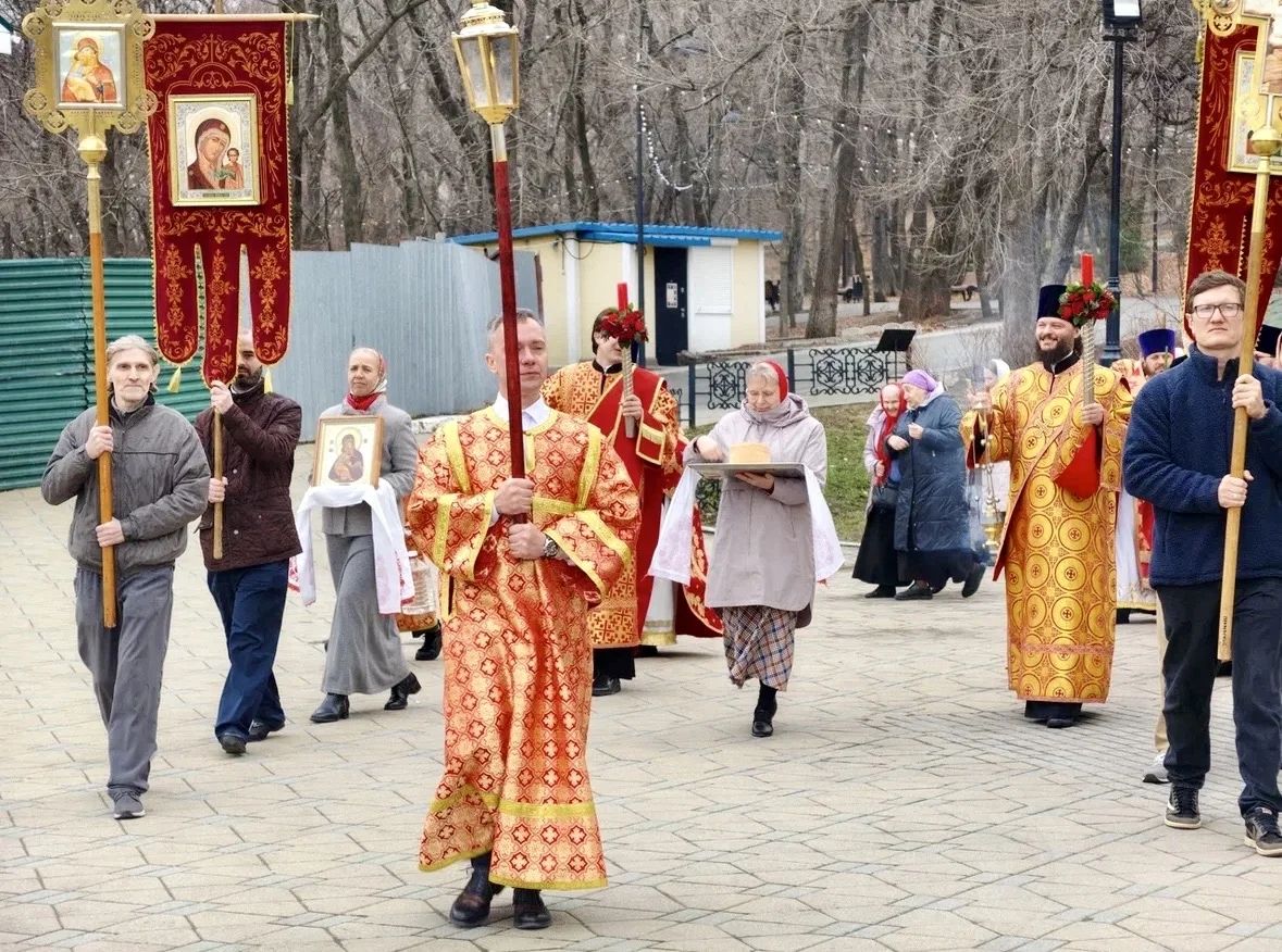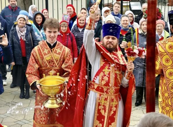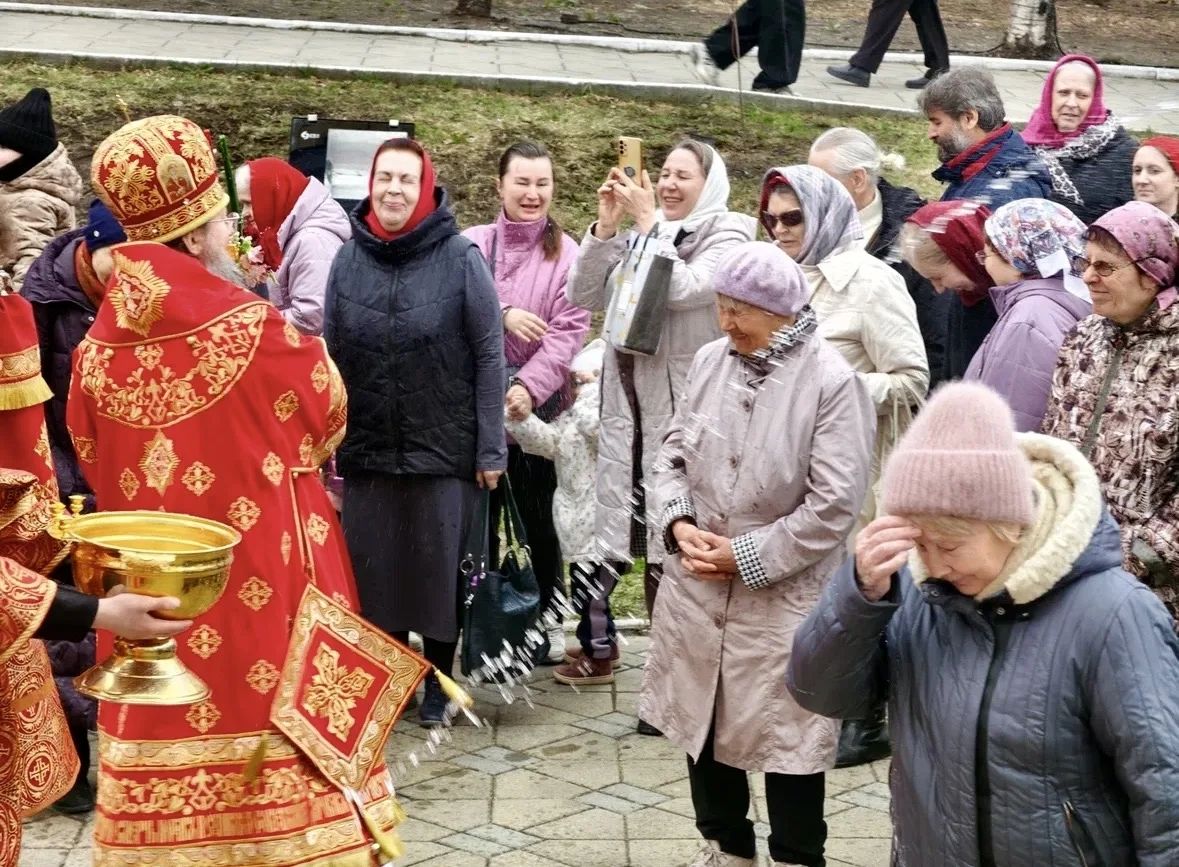 Затем духовенство, клир и По окончании Литургии владыка Павел, духовенство и прихожане прошли крестным ходом вокруг храма, во время которого верующих окропляли святой водой.