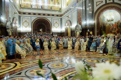 В этот день Богослужение в соборе возглавил Блаженнейший Папа и Патриарх Александрийский и всей Африки Феодор II, которому сослужил Святейший Патриарх Московский и всея Руси Кирилл и другие предстоятели и представители поместных православных Церквей. В их числе: Блаженнейший Патриарх Иерусалимский Феофил III; Святейший Патриарх Сербский Ириней; Блаженнейший Патриарх Румынский Даниил; Блаженнейший Архиепископ Кипрский Хризостом II; Блаженнейший Архиепископ Тиранский и всей Албании Анастасий; Блаженнейший Митрополит Варшавский и всей Польши Савва; Блаженнейший Митрополит Чешских земель и Словакии Ростислав; Блаженнейший Митрополит всей Америки и Канады Тихон; митрополит Ахалцихский и Тао-Кларжетский Феодор, глава делегации Грузинской Православной Церкви; митрополит Ловчанский Гавриил, глава делегации Болгарской Православной Церкви.