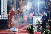 13 апреля, в понедельник Светлой седмицы, Святейший Патриарх Московский и всея Руси Кирилл совершил Божественную литургию в Патриаршем Успенском соборе Московского Кремля.