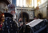 Вечером 9 апреля, в канун пятницы Страстной седмицы, Святейший Патриарх Кирилл совершил утреню Великой Пятницы с чтением 12-и Евангелий Святых Страстей Господа нашего Иисуса Христа в кафедральном соборном Храме Христа Спасителя г. Москвы.