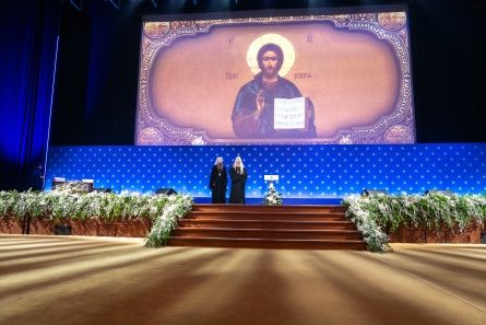 В зале собрались архиереи Русской Православной Церкви, представители Поместных Православных Церквей, члены Межрелигиозного совета России, руководители органов власти, ректоры вузов, педагоги и общественные деятели.