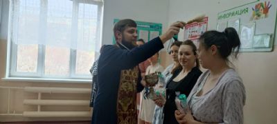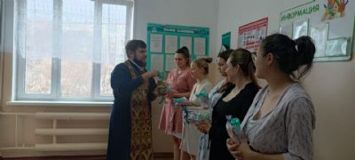 Священник поздравил женщин с Пасхой Христовой и окропил святой водой. Пожелал будущим мамам сил духовных и телесных в воспитании детей, вручил иконочки с молитвой и подарки с детскими принадлежностями.