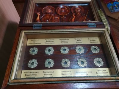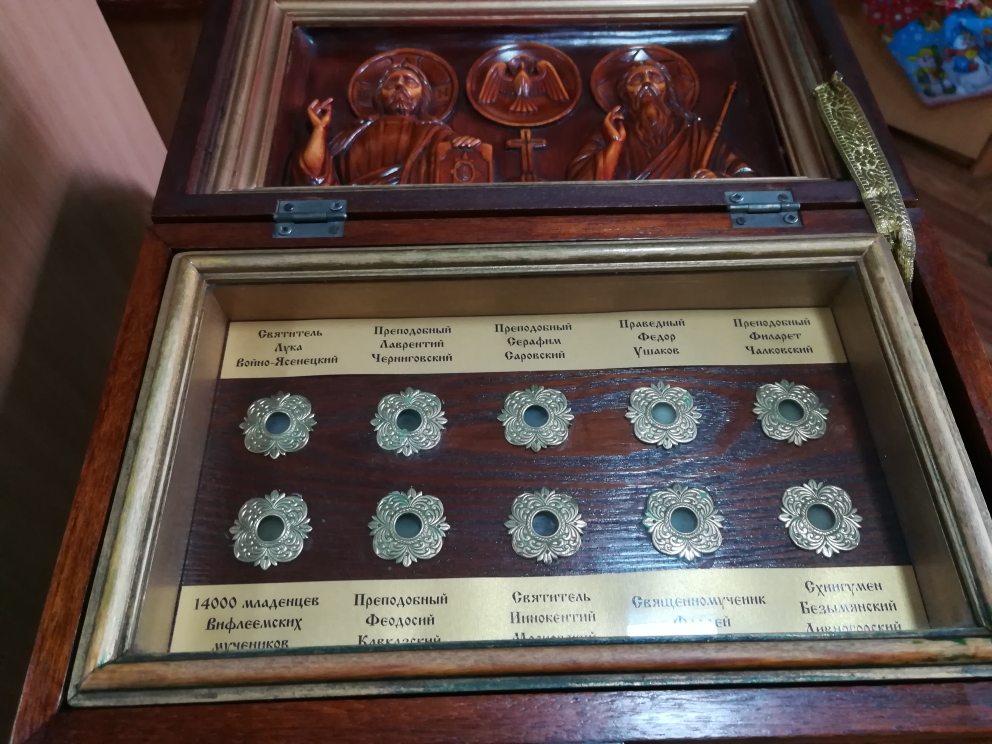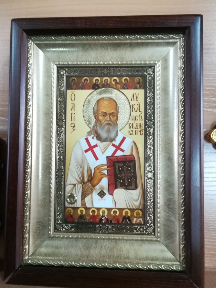 Справка: На приходе Покрова Божией Матери в храме св.прав.Иоанна Кронштадтского находятся икона и ковчежец со святыми мощами свт.Луки Симферопольского и Крымского. В больничном храме при Тысячекоечной больницы (ул.Русская, 57, строение 7), также есть икона святителя с мощами.