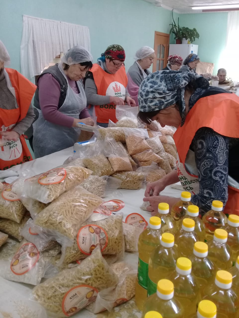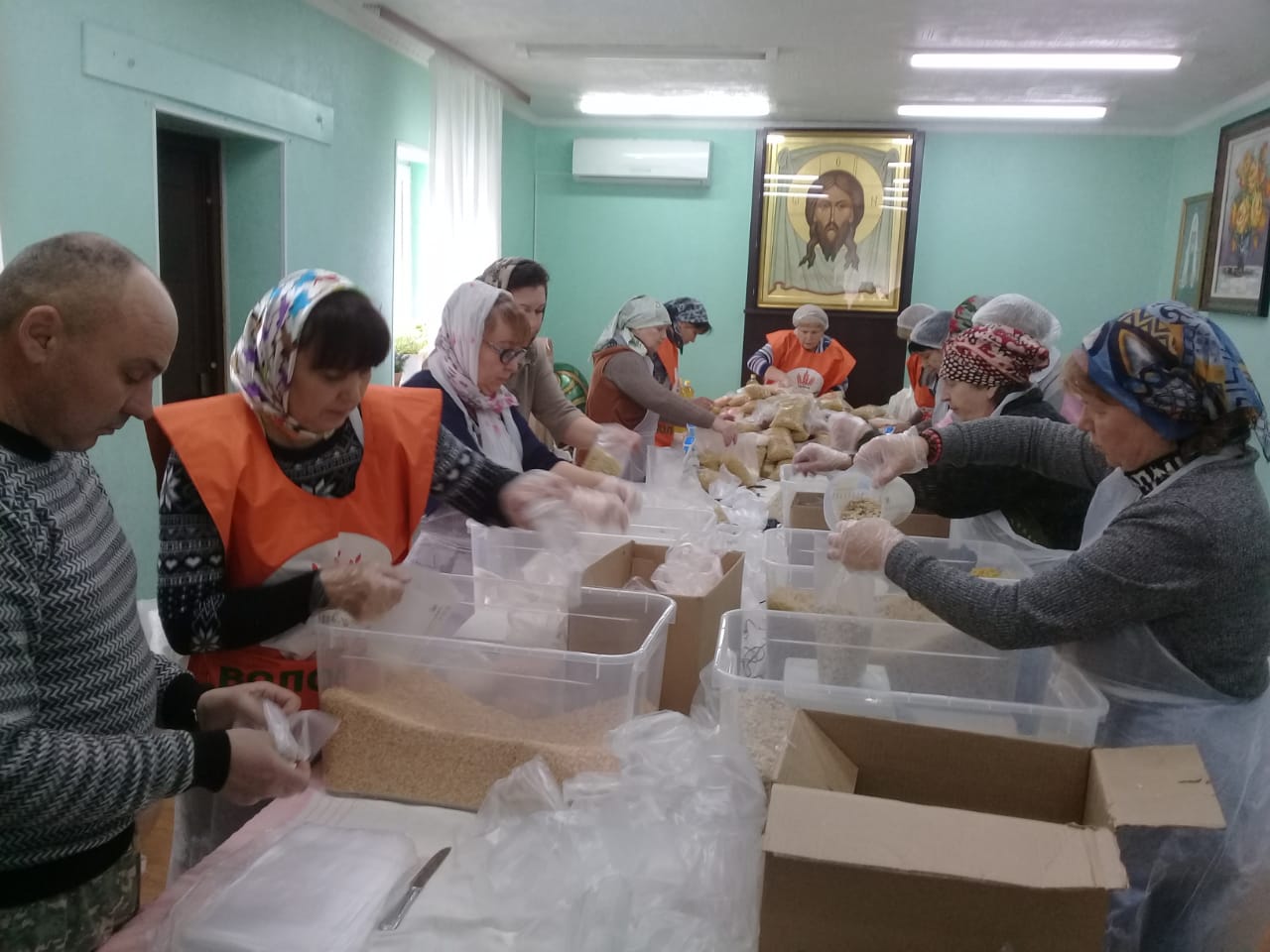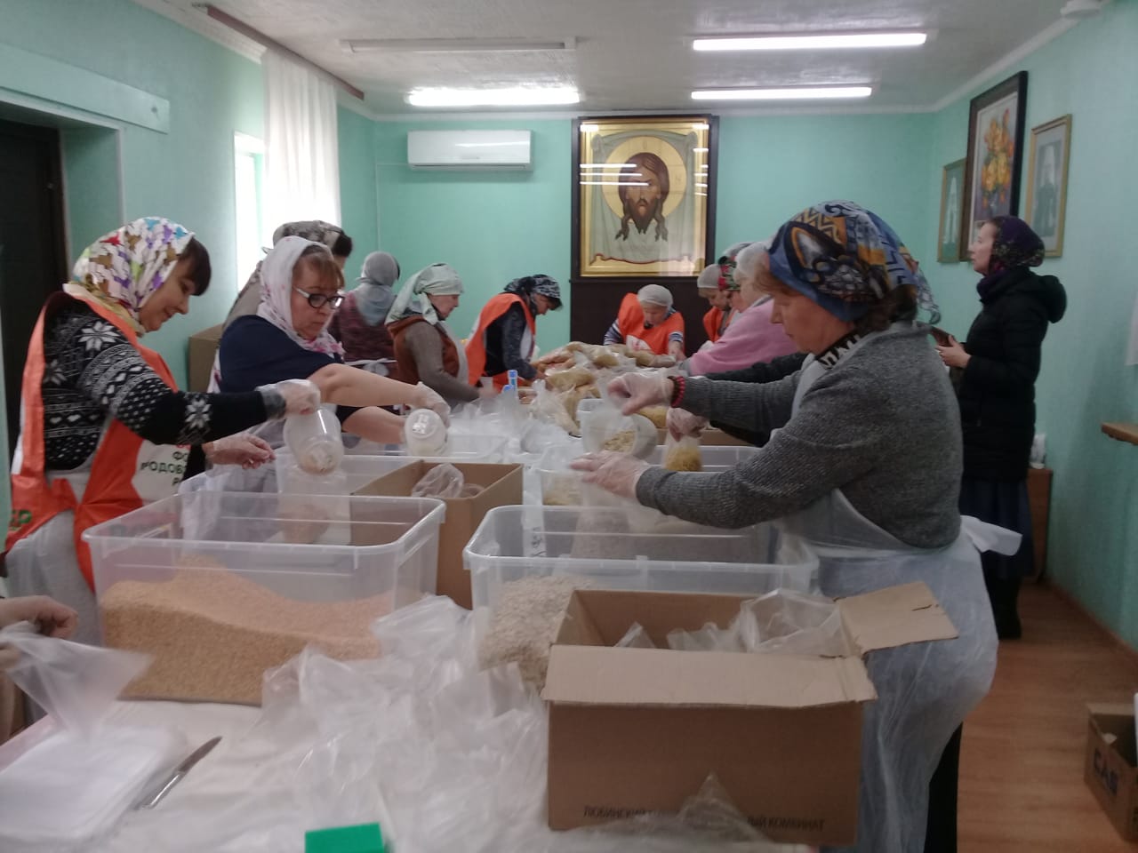 Добровольцы расфасовали 200 наборов для малообеспеченных: многодетных, одиноких, инвалидов, бездомных.