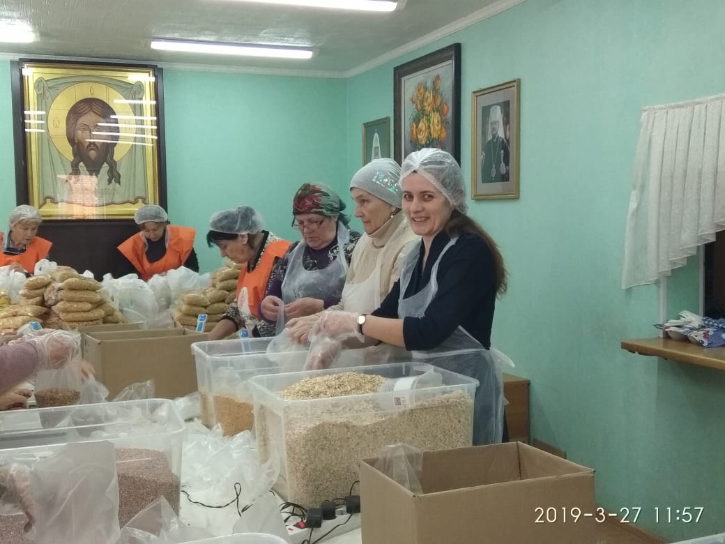 27 марта 2019 г. на приходе Покровского храма в рамках Всероссийского добровольческого проекта «Народный обед», который реализуют Фонд продовольствия «Русь» и Служба помощи «Милосердие» (г.Москва) прошла фасовка народных обедов.