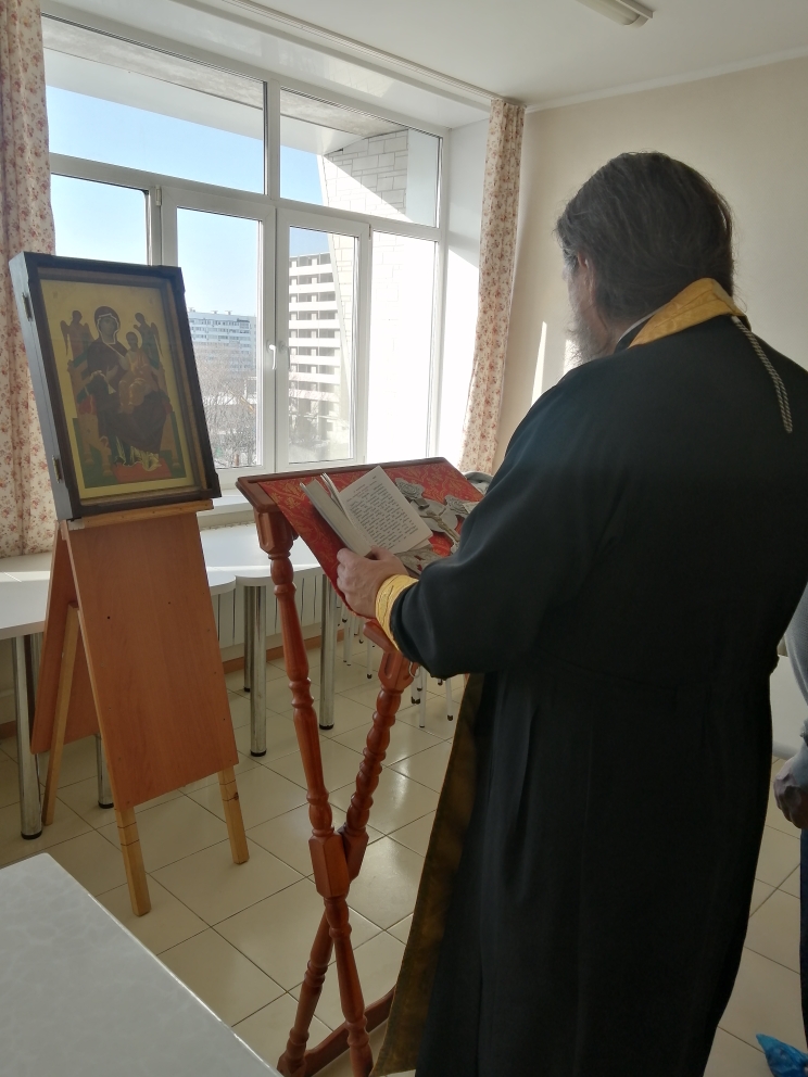 Протоиерей Александр Талько отслужил молебен перед иконой Божией Матери Всецарица (Пантанасса). В больничном храме св.вмч.и цел.Пантелеимона (ул.Русская, 57/7) есть список с иконы, написанный на Святой Горе Афон, который был принесен в отделение радиологии для молитвы.