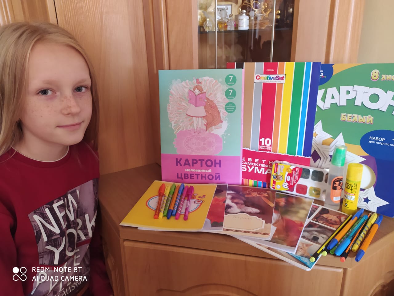 Благодаря жертвователям удалось закупить школьные принадлежности: тетрадки, дневники, краски, фломастеры, ручки, клей, наборы для творчества.
