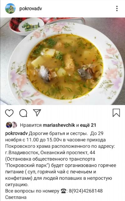 Покровский храм г.Владивостока (Океанский проспект, 44) организовал горячее питание для пострадавших от стихии людей. С понедельника по пятницу с 11.00 до 15.00 в здании бывшей часовни в честь св.прав.Серафима Саровского на территории Покровского парка можно бесплатно подкрепиться горячим обедом.